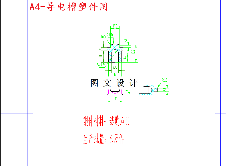 本塑件的材料为苯乙烯-丙烯晴共聚物AS(热塑性塑料)①无定型塑料,吸湿性大,热稳定性好,不易分解。 ②流动性比ABS好,不易出飞边。 ③易发生裂纹,塑件应避免尖角、缺口,顶出均匀,脱模斜度易取较大。 ④进料口易发生裂纹。 ⑤成型收缩率小,比热容较低,在料筒中塑化效率高,在模具中凝固也较快,模塑周期短。