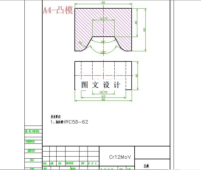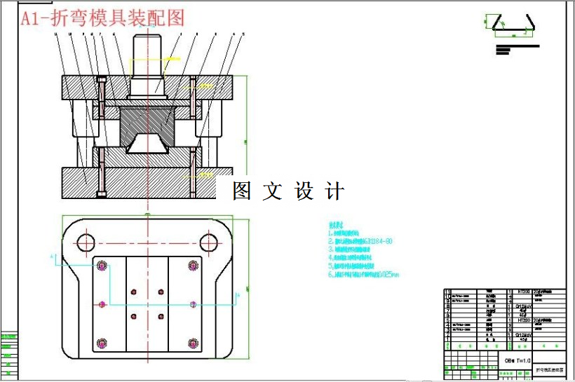 该制件的材料是08钢是一种高碳钢,而该制件的厚度是1mm。该零件是负角度冲压,结构简单,但是制作有点困难。方案(1)(2)属于单工序模冲裁工序冲裁模指在压力机一次行程内完成一个冲压工序的冲裁模。由于此制件生产批量大,尺寸又较这两种方案生产效率较低,操作也不安全,劳动强度大,故不宜采用。方案(3)属于连续模,是指压力机在一次行程中,依次在模具几个不同的位置上同时完成多道冲压工序的模具。于制件的结构尺寸小,厚度小,连续模结构复杂,又因落料在前弯曲在后,必然使弯曲时产生很大的加工难度,因此,不宜采用该方案。
