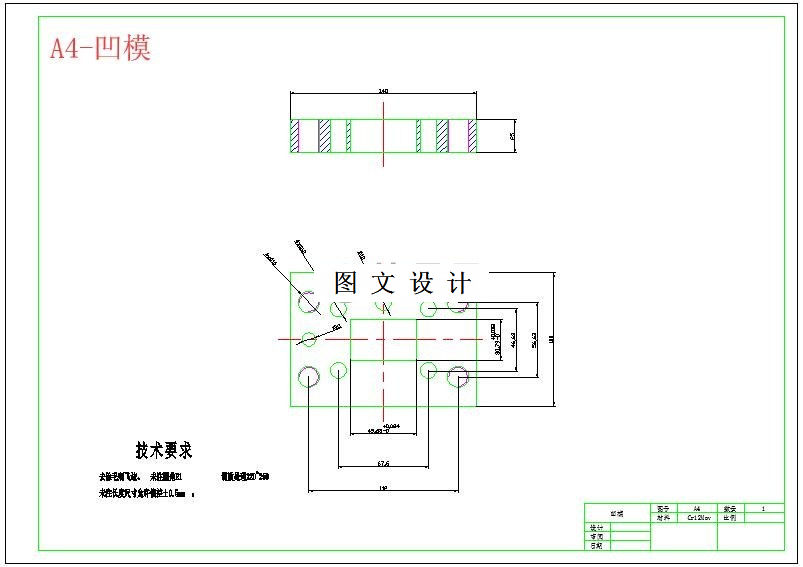 工件的结构简单,为一带圆角的长方形,长宽分别为50和31;零件呈轴对称分布,零件中心为一直径为8的圆孔,在零件的四角分布直径为5的圆孔;在长度方形上两圆孔的中心距为36,宽度方向上的中心距为17。冲裁件的外形应尽量避免有尖锐的角,在各直线连接处,应由适当的圆角。为提高模具寿命,所以将连接处用R为3mm的圆角过渡。