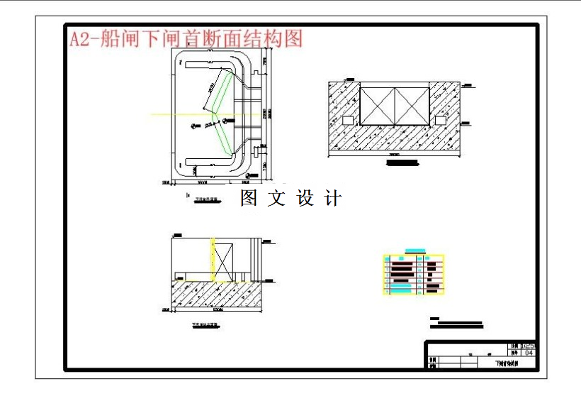 本船闸的设计船队为1000吨级1推4驳(2排2列),依据相应计算采用集中输水系统。本设计为了防止边墩的沉降影响闸门等设备的正常工作,选用整体式钢筋混凝土闸首结构。闸首结构的计算,分四种最不利情况进行,计算了各种情况下的荷载,稳定性验算以及底板的计算,最后根据闸首底板结构内力计算进行构件配筋。