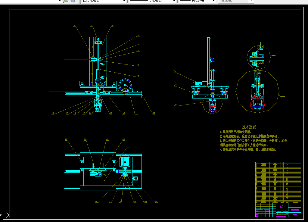 该机械手采用电机驱动,实现了伸缩、升降、夹紧等动作。为了现实这些动作,采用部件设计,分别实现这些动作。比如了为实现伸缩这个动作,设计了一个水平伸缩机构。PLC把各个部件的独立运动协调起来,形成了一个有规则运动系统。各个部件的联接,先铸造出一个合格的机械本体,把各个部件安装在机械本体上,形成一个机器。控制系统采用PLC控制,程序用梯形图编写。