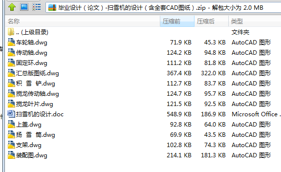 情的小型机械旋转式扫雪机的设计方案。本设计由汽油机提供动力。经输出轴输出动力,通过链传动传递动力,带动其他工作。该扫雪机的工程是利用搅龙旋转将雪集中并向后推送,通过搅龙的向后推力及螺旋桨产生的吸力使其到达螺旋桨。由于螺旋桨高速旋转产生巨大的作用力,雪被高速推向弯管,再通过与弯管壁撞击折射出去。从而达到清除积雪的目的和最佳效果。
