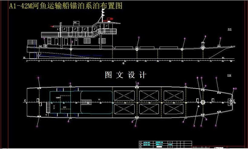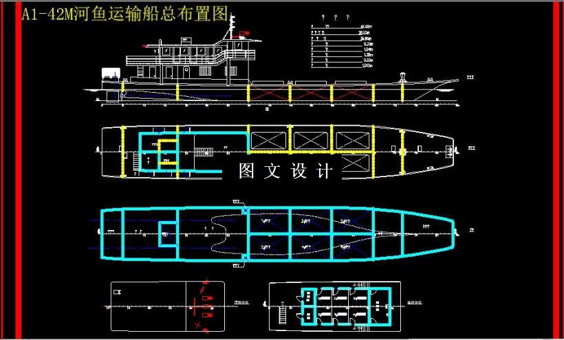 这次设计的主要任务:42m河鱼运输船的技术设计。在这个阶段里,要确定与船舶技术经济性能关系最大的一些项目,如船的主尺度和排水量、船体型线、建筑型式及总布置、舾装设计主要装置系统等等。同时要进行船舶主要性能计算,绘制总布置图图纸,编写舾装设备计算书、空船重量重心计算书、吨位计算书,同时编制出全船说明书。