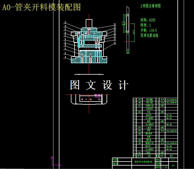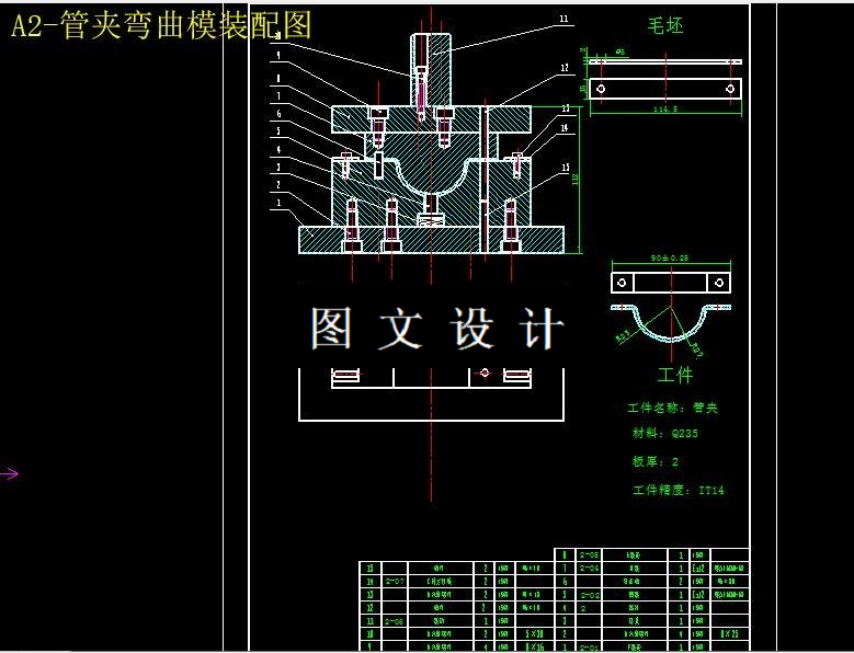 本说明书针对弯曲件(管夹)来进行工艺分析、工艺方案的确定,然后根据这些分析来进行冲压模具的设计,内容包括排样设计,计算冲压力、弯曲力,确定模具压力中心,计算落模的刃口尺寸、以及确定凸凹模结构的尺寸等方面;最后根据设计来进行选择压力机以及绘制装配图和零件图。