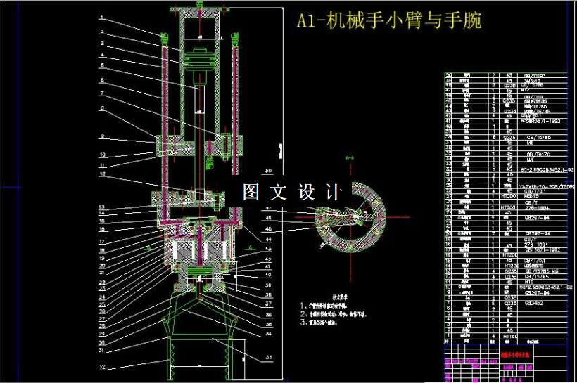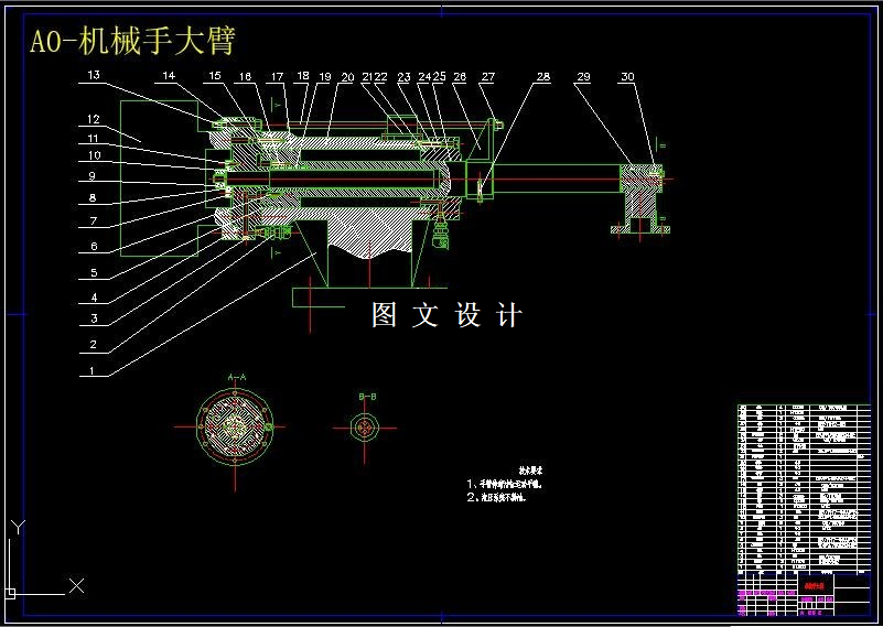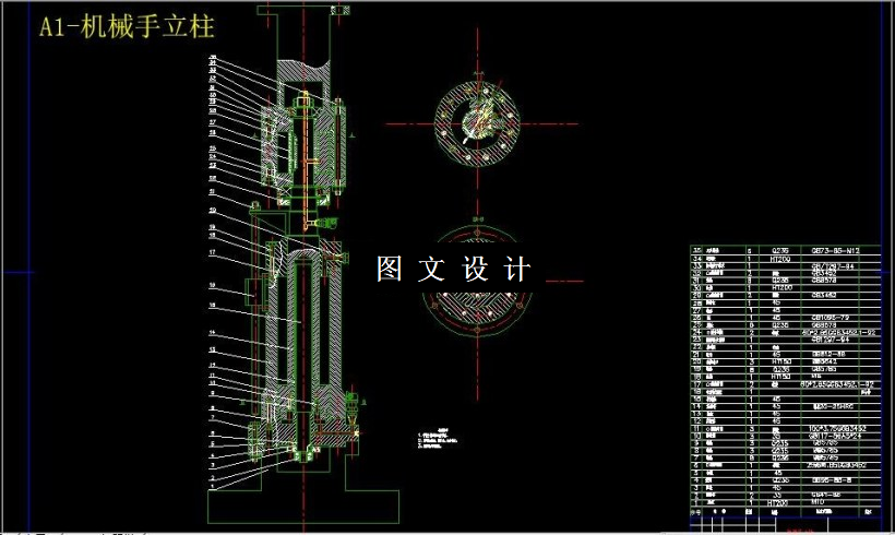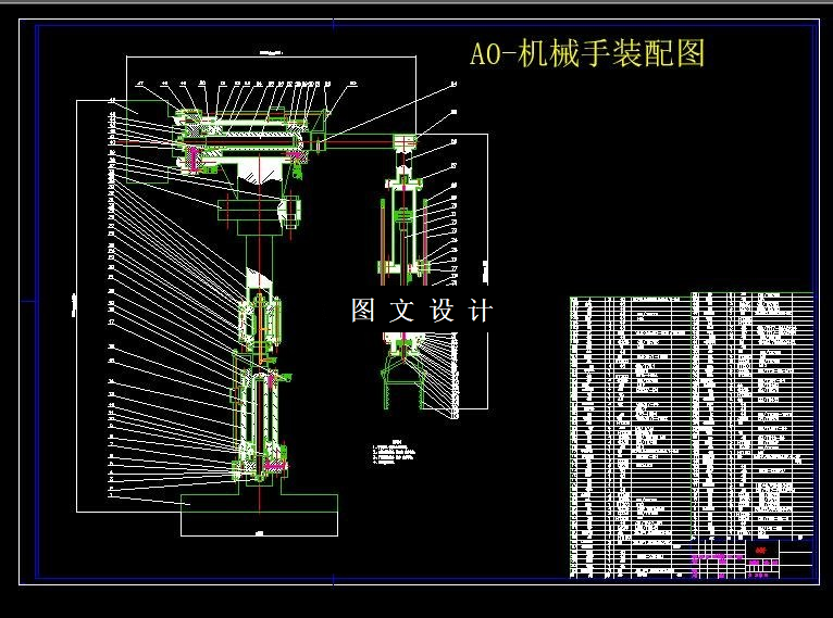 本次设计的多功能机械手用于R175型柴油机机体加工自动线上,主要由手爪、手腕、手臂、机身、机座(立柱)等组成,具备上料和转位等功能,并按该自动线的统一生产节拍和生产纲领完成以上动作。本机械手机身采用机座式,自动线围绕机座布置,其坐标形式为圆柱坐标式,具有立柱旋转、立柱升降、大臂伸缩、小臂升降、腕部转动4个自由度,外加一个重复自由度-小臂升降。驱动方式为液压驱动,且选用双联叶片泵,系统压力为2.5MPa,电机功率为5.5KW,共有整机回转油缸、立柱伸缩缸、大小手臂伸缩油缸、手腕回转油缸、手爪夹紧油缸6个液压缸;定位采用机械挡块定位,定位精度为0.5~1mm,采用行程控制系统实现点位控制。