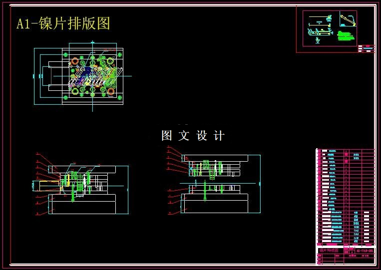 本设计为连续模模具设计,设计的产品为镍片。经过查阅资料,首先对零件进行工艺分析,经过工艺分析和对比,采用冲孔落料工序,通过冲裁力、顶件力、卸料力等计算,确定压力机的型号。再分析对冲压件加工的模具适用类型选择所需设计的模具。得出将设计模具类型后将模具的各工作零部件设计过程表达出来。 在文档中第一部分,主要叙述了冲压模具的发展状况,说明了冲压模具的重要性与本次设计的意义,接着是对冲压件的工艺分析,完成了工艺方案的确定。第二部分,对零件排样图的设计,完成了材料利用率的计算。再进行冲裁工艺力的计算和冲裁模工作部分的设计计算,对选择冲压设备提供依据,最后对主要零部件的设计和标准件的选择,为本次设计模具的是绘制和模具的成形提供依据,以及为装配图各尺寸提供依据。通过前面的设计方案画出模具各零件图和装配图。 本次设计完成冲模分析与设计,绘制整套装配图及零件图。本模具性能可靠,运行平稳,提高了产品质量和生产效率,降低劳动强度和生产成本。