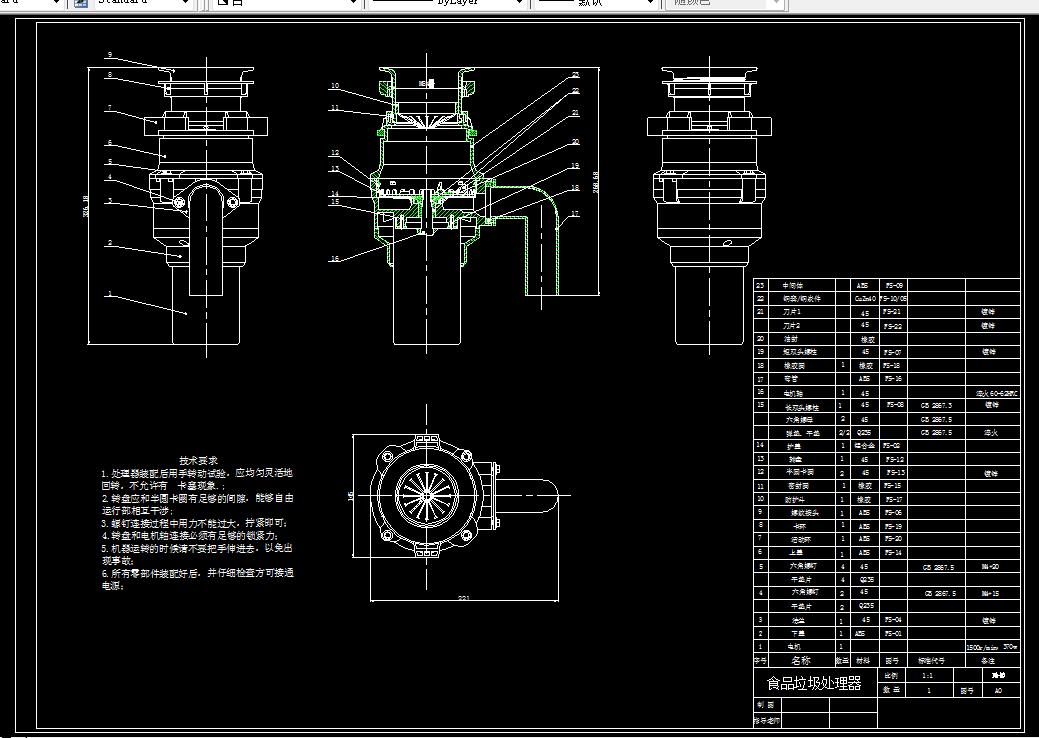 本设计依据我国实际情况,研制适合本国的厨房食物垃圾预处理装置——食物垃圾处理器。垃圾处理器的驱动电机和粉碎刀盘为机器的关健部分,直接影响机器的使用效果,所以本设计着重对粉碎刀盘和驱动电机进行设计论述。对于粉碎刀盘和刀片,先对工作载荷进行力学分析,计算流体阻力,进而选择材料及对刀盘、刀片进行强度校核。根据我国食物垃圾的特点,设计采用组合刀盘式粉碎刀。设计中驱动电机的运行特征为时间短,启动频繁,断续工作,其性能直接影响着厨房食物垃圾处理器质量的好坏,本设计采用电机为永磁直流电动机,它的优点是结构简单、体积小、出力大、效率高。此次设计的食物垃圾处理器,避免了目前同类产品完全采用交流电机、选用昂贵材料的做法,使机器的制造和使用成本降低。