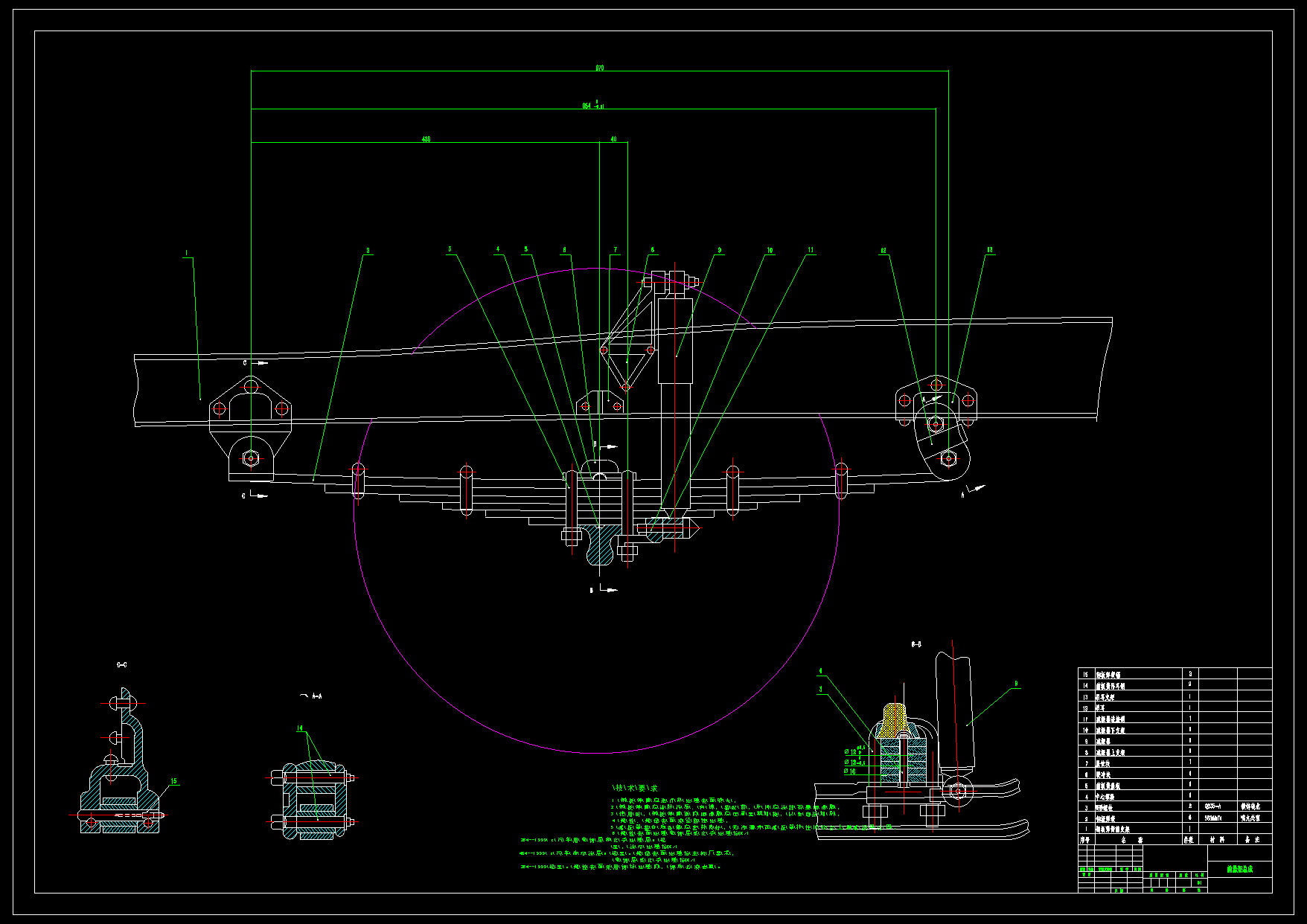 悬架是车架与车桥或车轮之间的一切传力连接装置的总称,其作用是传递作用在车轮和车架之间的力和力矩,并且缓冲由不平路面传给车架或车身的冲击力,并衰减由此引起的震动,以保证汽车能平顺地行驶。设计过程中,首先根据悬架设计的主要技术参数,确定悬架的结构形式,设计钢板弹簧的主要尺寸;其次对极限工况下的钢板弹簧进行强度校核,以及对钢板弹簧卷耳和弹簧销进行强度核算;最后对减振器的参数进行设计计算。