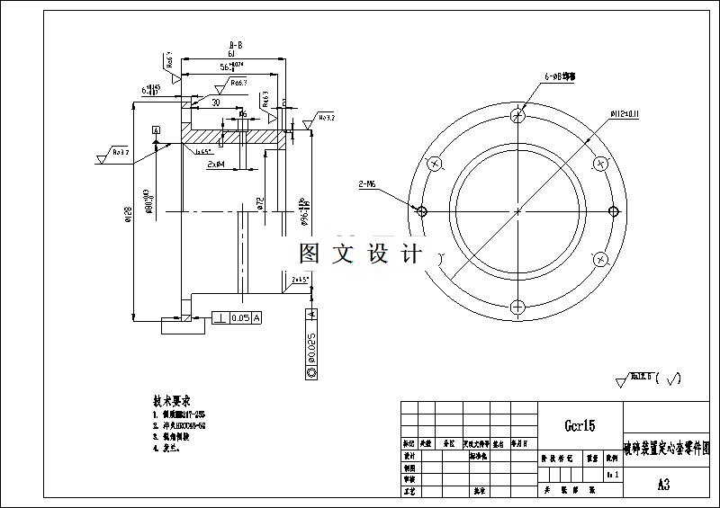 本文的内容是矿样破碎装置定心套制造工艺设计,包含零件的工艺分析,零件的工序确定,零件的材料选择,采用GCr15进行加工;工艺部分主要是针对零件的材料性能从而给出一个合适的加工工艺。工艺设计依据GCr15材料的性能确定采用锻造方法成型毛坯,依据图纸技术要求公差特点和工件的形状来确定加工方案零件的加工方式确定,切削用量的计算,切削工时的设计,夹具误差尺寸的计算,夹具装置的选择,用CAD完成夹具零件的设计装配。通过本次设计,可以提高零件的生产效率,降低生产成本,在一套铣床上完成铣右端面工序的夹具设计,实现了托板的批量化生产。