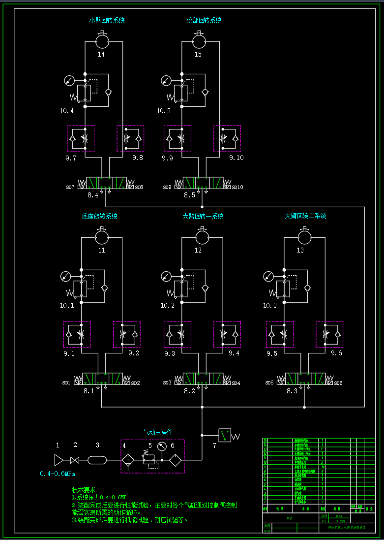 整个系统气源由空气压缩机提供,气源压力在0.4-0.6MPa,分五路系统,即底座旋转系统,大臂回转一系统,大臂回转二系统,小臂回转系统,腕部回转系统。