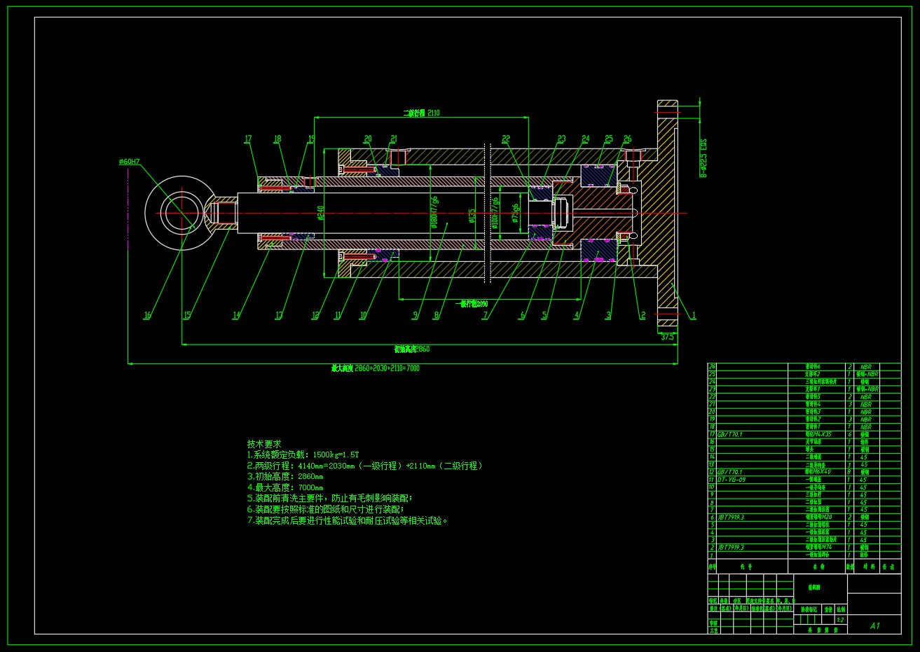 总高度≥6000mm,取7000mm 承重:1.5T=15000N 压力:2.5Mpa 驱动形式:双向驱动 经过对装置工况分析,实现了7000mm的最大高度,初始高度为2900mm,在系统额定负载为1.5T的时,系统压力为2.5MPa,可以驱动油缸正常运行,油缸的基本参数为三级缸杆的直径d=75mm,二级缸筒的内径为100mm,二级缸筒的外径为135mm。 在满足性能要求的时候,采用两级液压缸形式,一级行程2100mm,二级行程2000mm。