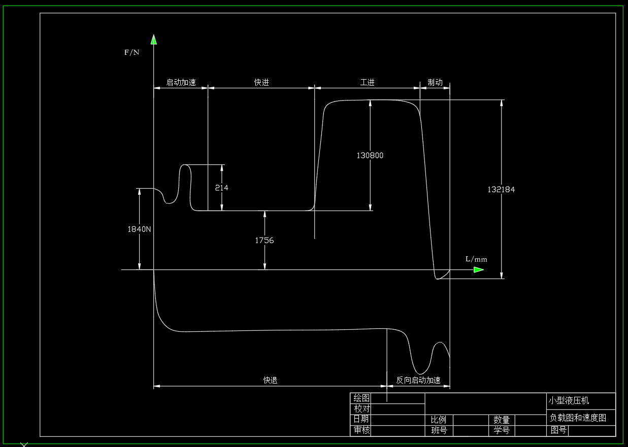 设计小型压机的液压系统,要求完成的工作循环为快速下降-慢速压制-保压延时-快速退回-原位停止。最大压制力为130KN,移动部件自重G=2100N,移动时摩擦力为1300N,快速下降时速度为4.8m/min,慢速压制时最大速度为0.2m/min,快退时速度为6m/min,设系统中压机的上升、下降加速时间为0.18秒,保压延时采用时间继电器控制。