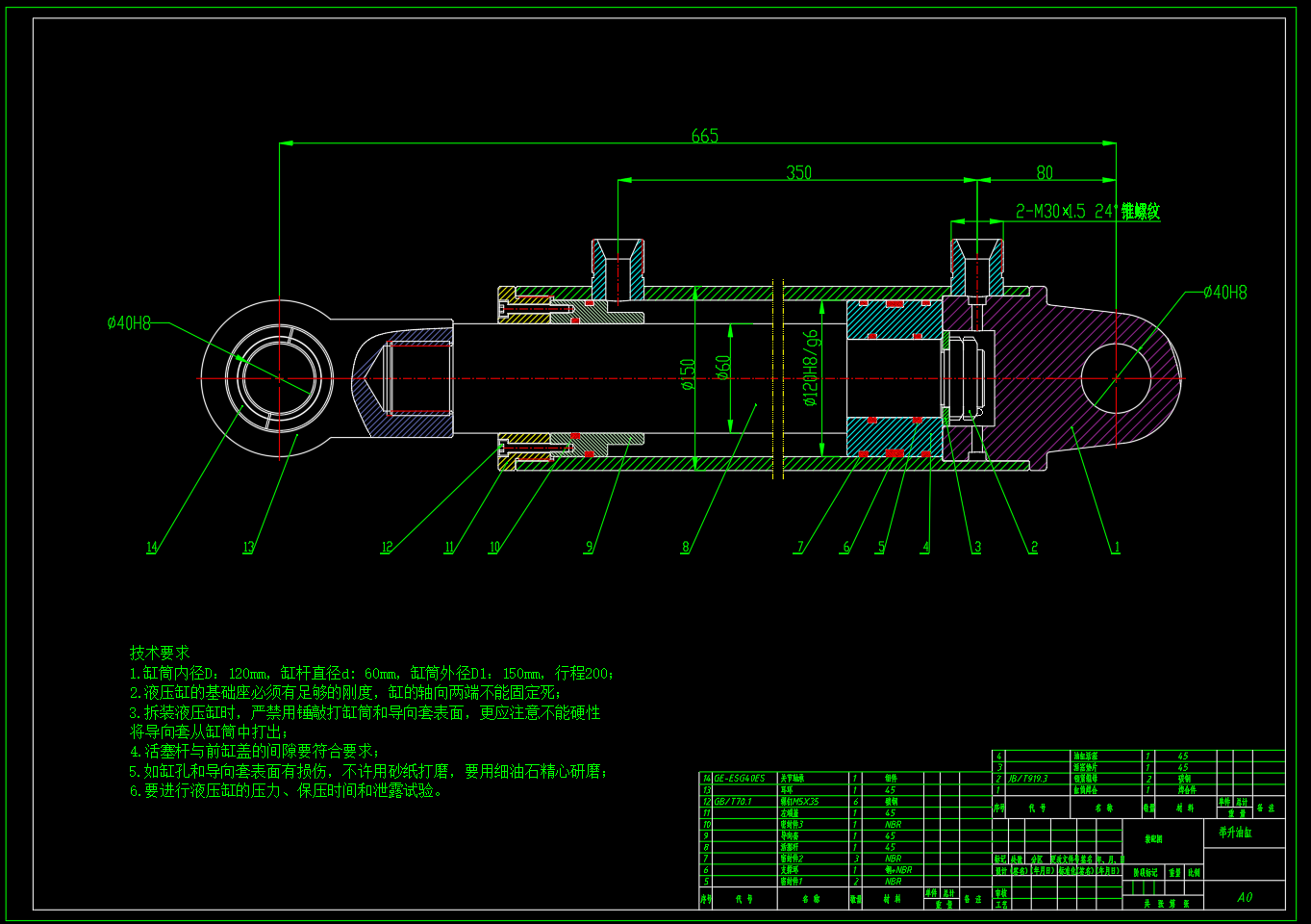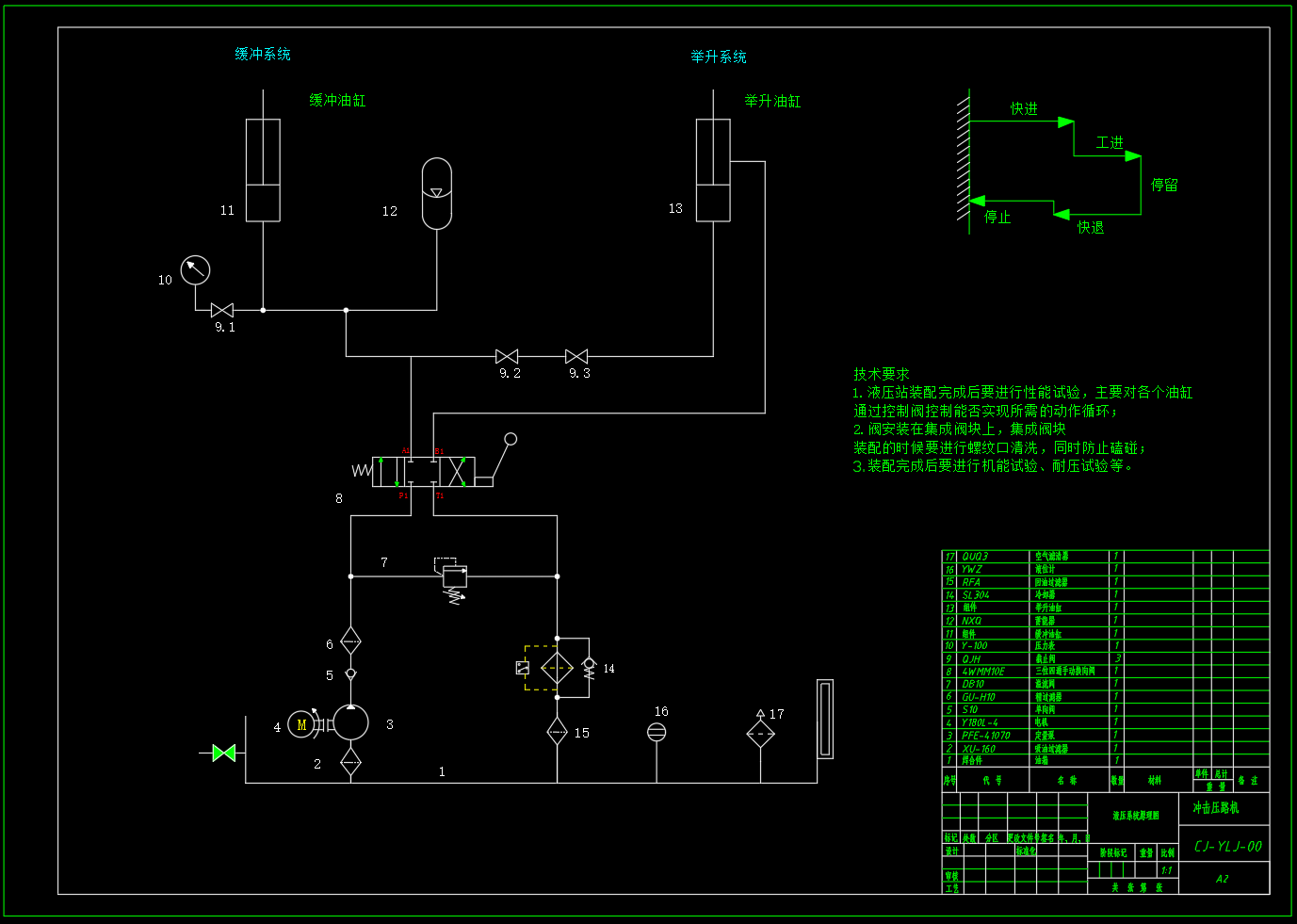 包含液压系统原理图两种方案,油箱焊合图,电气控制原理图,速度和负载图,油缸装配图以及零部件图。 对于液压系统方面展开基本功能动作的确定,系统工况的分析与计算,根据功能和工况分析设计满足执行机构要求的液压系统原理图,详细分析压路机的缓冲回路和举升回路,缓冲回路设置蓄能器,利用单作用缸串联实现,举升回路通过控制电磁阀实现有杆腔和无杆腔通油进而控制举升和收回,对举升油缸的参数进行计算,油缸的结构进行设计,同时对于整个液压系统的基本参数以及泵、电机进行计算选型。同时,利用FluidSIM软件进行液压回路仿真,实现液压系统的电控回路设计。