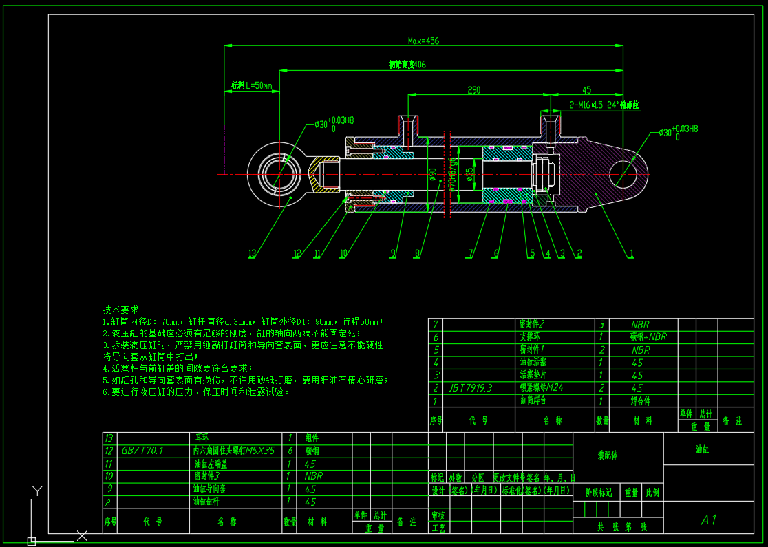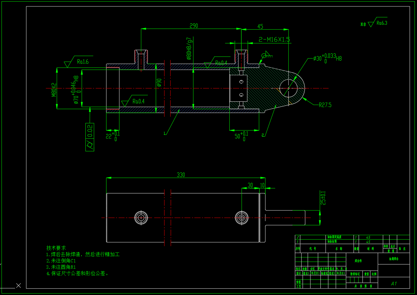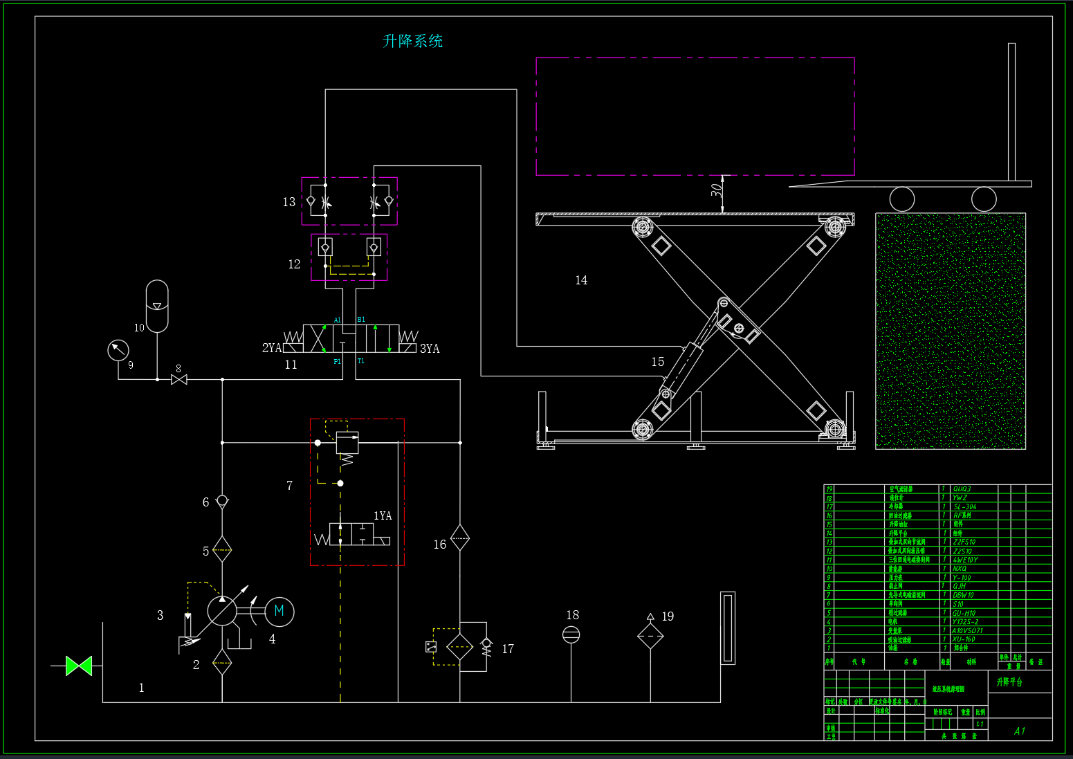 包含二维CAD的升降平台的总装配图,液压系统原理图,油缸装配图和缸筒焊合图。本次设计的目标是对载荷:1000mmx1000mmx300mm进行升降30mm,此设计采用卧进地面的形式设计平台,开始的时候,此平台与地面处于同一水平线,当载荷物放上的时候,通过控制油缸进行升降。此升降平台由底座和支腿作为底部支撑部分,用于支撑整个载荷的升降。通过设置回转轴,通过轴承连接,当油缸通过液压系统控制,实现缸杆的伸缩,进而实现了平台的升降。由四个大臂组成,两两通过轴焊接成一个组件,共同组成剪叉式的升降平台,平台上方设置一个用于载物的平台,尺寸要大于承载物。