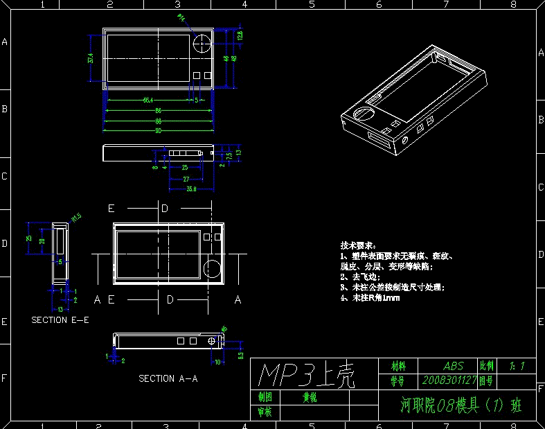 本设计是以MP3上壳为主题。其设计思路由参考多个生产事例而得出,设计内容是从零件的工艺分析开始的,根据工艺要求来确定设计的大体思路。在设计当中,很多东西都是自己原来所没有接触过的,尤其是前段时间所学的理论课知识与现在的自己动手操作设计,设计顺序开始是从零件的材料选择,接下是成型参数、密度、收缩率的确定,模具种类与模具设计的关系、塑件的尺寸精度与结构、注射机的选择、模具设计有关尺寸的计算(包括模具行腔型芯的计算及其公差的确定)、注塑机参数的校核、模具结构设计、模具冷却、加热系统计算、注射模标准件的选用及总装技术要求等内容。