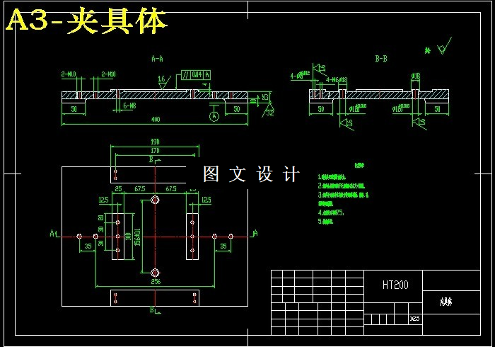 本次设计内容涉及了机械制造工艺及机床夹具设计、金属切削机床、公差配合与测量等多方面的知识。 固定板工艺规程及其钻、攻4-M12螺纹的工装夹具设计是包括零件加工的工艺设计、工序设计以及专用夹具的设计三部分。在工艺设计中要首先对零件进行分析,了解零件的工艺再设计出毛坯的结构,并选择好零件的加工基准,设计出零件的工艺路线;接着对零件各个工步的工序进行尺寸计算,关键是决定出各个工序的工艺装备及切削用量;然后进行专用夹具的设计,选择设计出夹具的各个组成部件,如定位元件、夹紧元件、引导元件、夹具体与机床的连接部件以及其它部件;计算出夹具定位时产生的定位误差,分析夹具结构的合理性与不足之处,并在以后设计中注意改进。
