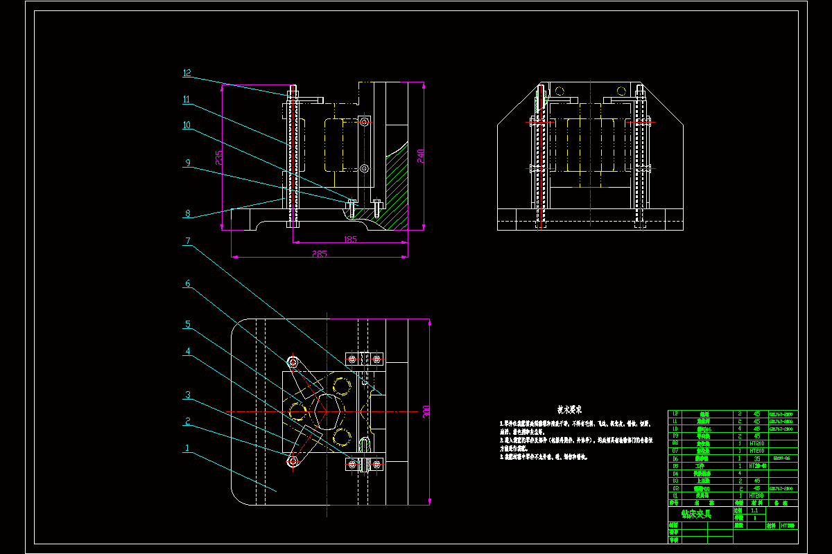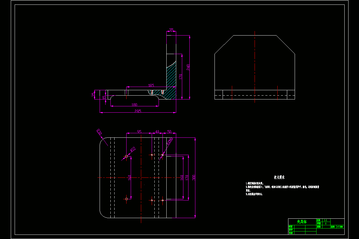 夹具是零件加工的夹紧装置,是加工零件的一种必不可少的装置。随着零件的尺寸变化,越来越多的夹具被淘汰了,因此,设计一套专用夹具是十分有必要的。在设计专用家具时要考虑工件的定位方案,工件的夹紧方案和设计夹紧机构,夹具的其他组成部分,夹具的结构形式等。 俩侧面深20 2-M6-7H螺纹底孔钻夹具设计是包括零件加工的工艺设计、工序设计以及专用夹具的设计三部分。在工艺设计中要首先对零件进行分析,了解零件的工艺再设计出毛坯的结构,并选择好零件的加工基准,设计出零件的工艺路线;接着对零件各个工步的工序进行尺寸计算,关键是决定出各个工序的工艺装备及切削用量;然后进行专用夹具的设计,选择设计出夹具的各个组成部件,如定位元件、夹紧元件、引导元件、夹具体与机床的连接部件以及其它部件;计算出夹具定位时产生的定位误差,分析夹具结构的合理性与不足之处,并在以后设计中注意改进。