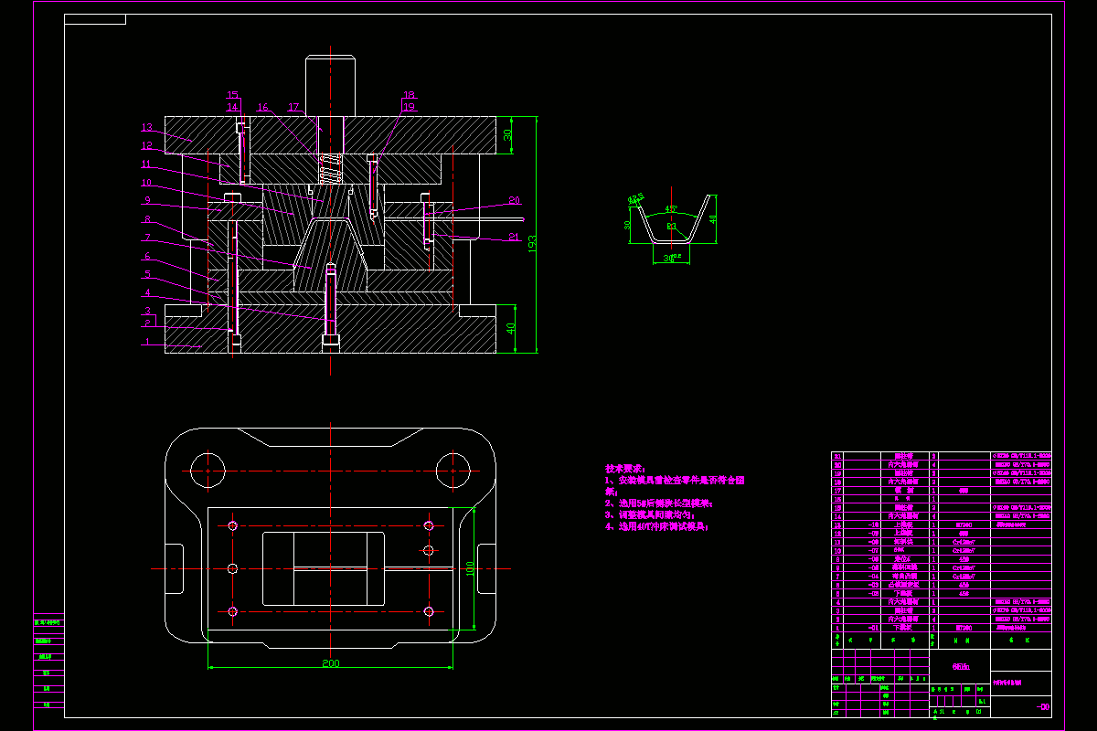 本设计主要对卡簧冲压模具进行设计。结合公司实际生产要求和产品的特点,在厂原有的设计上,对模具进行了改进设计。本设计对卡簧加工工艺进行了分析,得出了最佳加工方案,在充分保证零件质量与精度的前提下,选择高生产率的加工工艺,降低生产成本,从而有效地节约了材料。本设计中使用计算机软件进行了辅助设计,在保证高精度的同时简化了传统的繁琐计算过程,使设计更为便捷。 该卡簧从坯料到完全成形,以前是使用两套模具:剪料,弯曲,所设计的两套模具较为典型,也具有一定的代表性。本设计的重点与难点是多道工序的结合以及对凸、凹模刃口尺寸的计算,因为它将直接影响零件的质量。