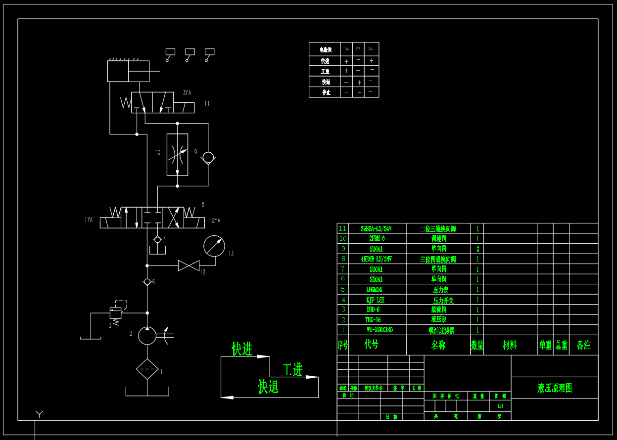 动作循环:快进-工进-停留-快退-停止 参数:部件总重m=2000kg,切削力FL=21000N,启动、加速和减速时间0.2s,快进速度4.2m/min,工进速度0.03m/min,快退速度4.2m/min,工作台最大行程500mm,快进行程150mm,工进行程≥300mm。