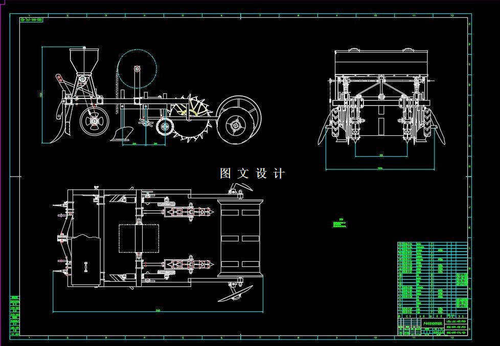 设计原始数据 1、外形尺寸:3000*1500*130mm 2、配套动力:28-55ps 3、与拖拉机连接方式:三点悬挂 4、行数:2行 5、垄距:1200—1400mm 6、施肥方法:侧深施肥 7、排种形式:一次投种内窝眼排种,二次投种鸭嘴式投种 8、覆膜方式:分土、铺膜、覆土 9、播种深度:压实后地表下3-5cm 铺膜采用前分土后合土的工艺原理,分土犁、地膜卡座、压膜轮采用同一小纵梁连接。可统一调节双方部件的位置关系,适应1200~1400mm宽度的地膜,调整方便快捷。压膜轮与地膜间距较长,水平距离小,减小地膜和水平面的角度,防止有拉膜、撕膜现象。 膜上播种的方式,具有保温、保墒、促进作物早熟和增产等显著效果。膜上打孔播种是近些年发展起来的一项新型播种技术,是对传统覆膜播种技术的一次革命,可省去人工破膜环节,节省工时,且可避免高温烧苗,确保全苗。播种器是膜上打孔播种机的核心部件,可完成破膜、打孔、投种等一系列动作,其设计质量是决定播种机性能的关键因素。现有的膜上打孔播种机常因播种器设计不合理,存在撕膜、挑膜、挑种等问题,作业性能不稳定。 采用圆盘覆土器,覆土量大能够满足农艺要求。覆土时会有少量土壤进入膜上滚筒内,滚筒上的缺口正对着鸭嘴排种器留下的小孔,土从缺口中流出,起到膜上覆土的作用。多余的土从中间缺口中流出,起到压膜的效果,而且膜上滚动轮会对垄有一定的压实作用。