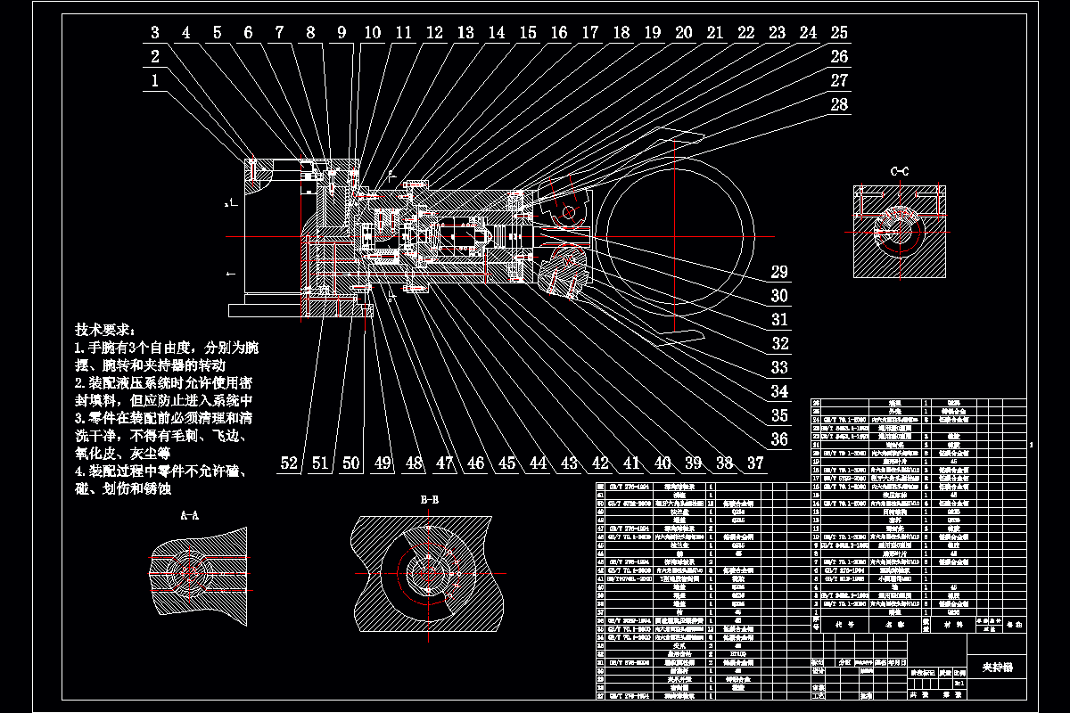 设计过程中,参照PUMA 560型机器人,取六个自由度,分别为底座的旋转、大臂转、小臂转、腕转、腕摆、夹持器的夹紧。机器人总共分为四个部分,手部、腕部、手臂、底座。对手腕部分的设计主要是驱动腕部旋转及夹持器夹紧的液压系统,具体为液压摆动缸、油路布置、柱塞缸的设计,其余回转装置都采用伺服电动驱动和谐波减速器减速,主要进行设计的是电动机与相应谐波减速器的选择及支撑结构的设计。设计过程中的螺栓、轴承、平键等都采用标准件,但由于机器人很多机构尚未制定相关的标准,这些结构都自行进行了设计。