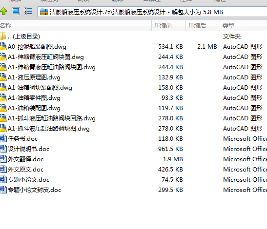 概括起来本文主要完成了七大部分的设计计算。第一部分论述了疏浚业的背景,国内为清淤泥船现状和趋势以及课程简介及工作过程。第二部分根据清淤泥船的实际工作环境条件以及经济条件对清淤泥船的总体方案进行了分析和选择。同时,也对液压系统中的各回路进行比较分析,选择合适的液压系统回路,从而设计出了液压系统的原理图。第三部分中主要对液压系统中各个执行元件做了动力和运动分析。在这部分中,通过计算确定了各液压缸及其尺寸和缸工作时的运动速度,也确定了马达及其参数。第四部分是根据前面的计算结果完成了液压系统中元件的选择。第五部分,由于液压系统中的设计内容基本上已经完成,故在这部分中主要是对所涉及的系统的各项技术指标(包括系统温升及压力损失)进行了验算。第六部分对油箱和液压阀块在内的液压泵站进行了设计。最后对清淤船液压系统进行维护。