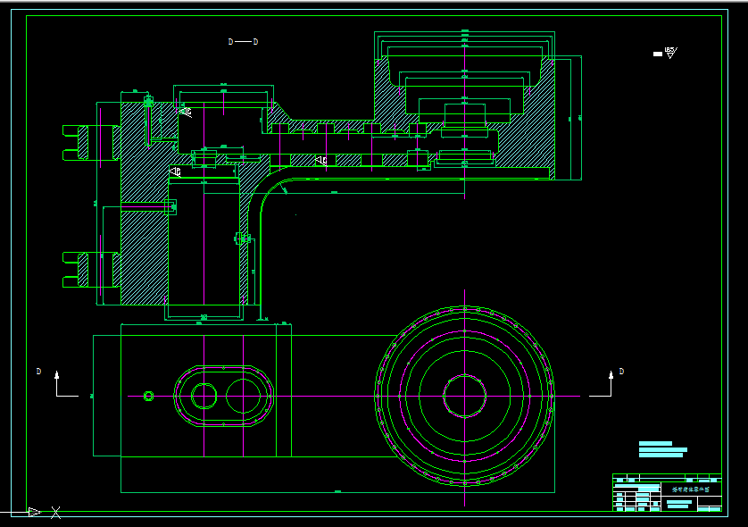 截割部是采煤机直接落煤、装煤的部分,其消耗的功率约占整个采煤机功率的80%-90%,主要由截割部壳体、截割电机、齿轮减速装置、滚筒等组成。该采煤机的截割部采用四级传动;前三级为直齿传动,第四级为行星传动。二级传动的圆柱齿轮为可换齿轮,使输出转速可根据不同的煤质硬度在两档速度内选取。截割部采用了三个惰轮轴,使采煤机能够满足截割高度对截割部长度的要求。设计将截割部行星减速器和滚筒直接联结,取消了安装在滚筒上的截齿,使结构简单、可靠。