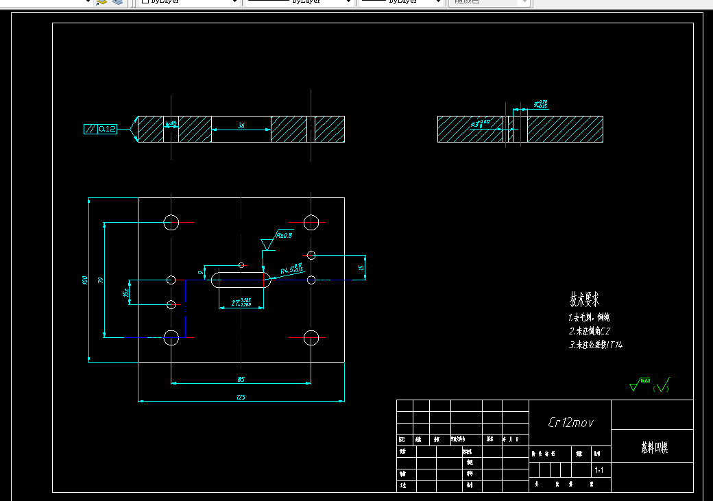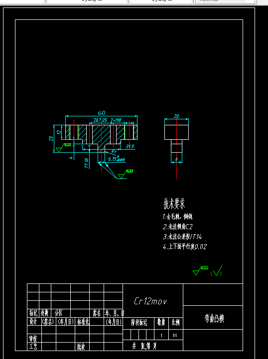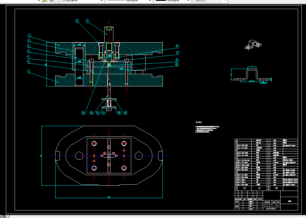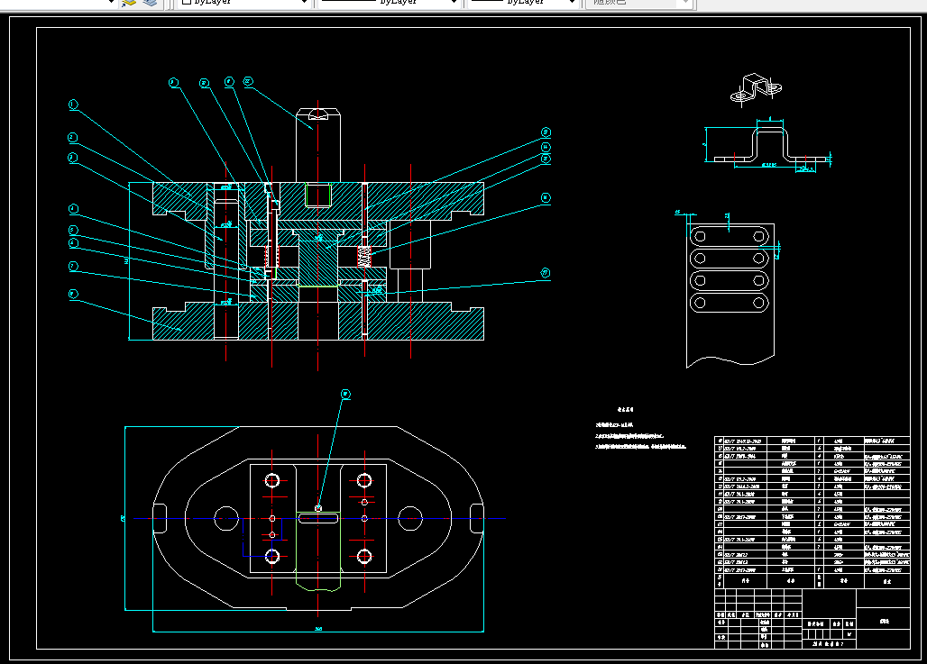 中因工业发展急速,模具行业乎步奇云。本又针对支架板冲裁和弯曲塑性的工艺性,进行分析设计比较。分析了三种工艺方案。聂终确定了一种方案,由范料模,弯曲模和冲孔模。三个单工序模完成零件加工。为完成零件的加工,高要分析了料的形状,加工工艺。模具主要零件的选择与设计。选择合迁的模架。挑选合过的压力机。完成模具的总装。绘制出合迁的装配图与零件图。941941