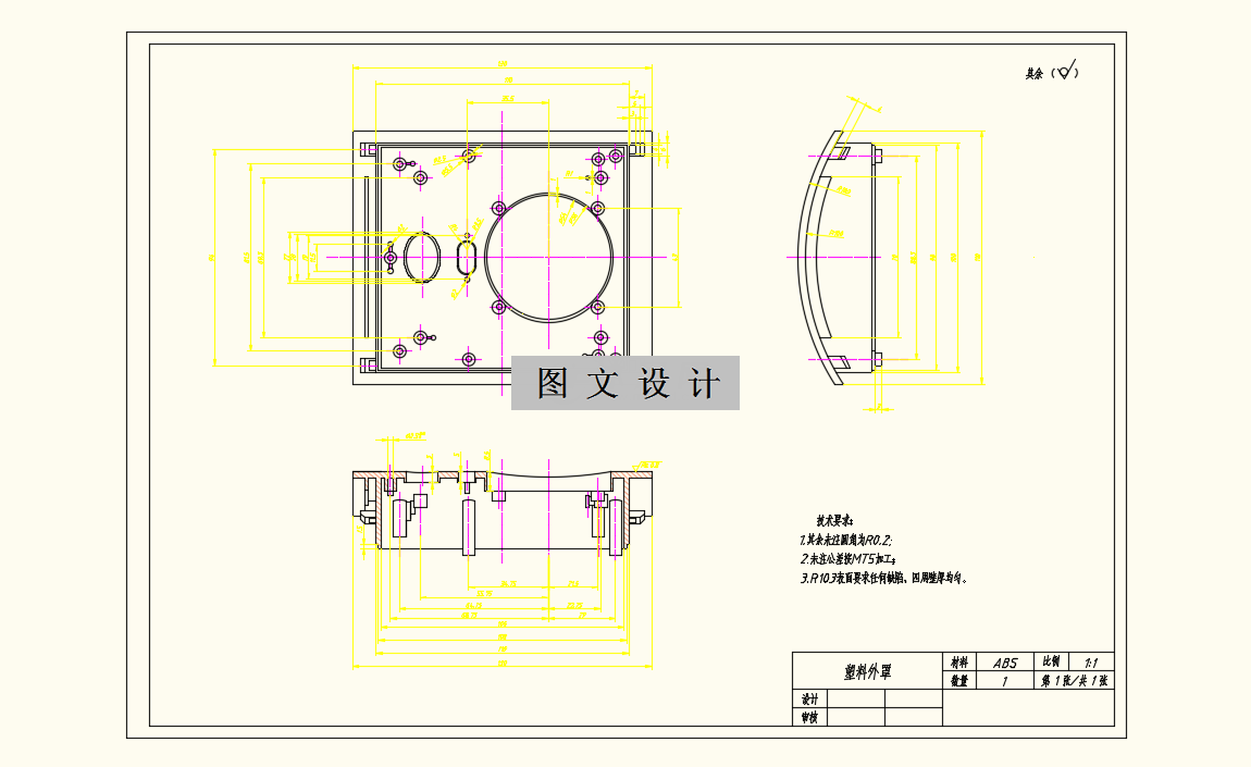本次设计的课题是行人过街按钮外罩注射模具设计,通过对零塑件的形状结构测绘得到各个尺寸,再用CAD绘制塑件的零件图,利用Moldflow进行相关的模流分析,最后经过模具设计绘制装配图和相关零件图。塑件为外罩类零件,材料为ABS,需要与其他外部元器件组合使用,外壳为曲面,较于其他表面光洁,内部设置了诸多参与配合固定的结构,整体制件精度要求不高。选择外壳曲面的下表面为分型面,一模一腔,从中间直径为54mm的圆孔中设置浇注系统,从圆孔侧面隐蔽处进浇,浇口形式是矩形侧浇口。模具采用推杆、推管组合的方式推出塑件,降低推出应力,倒扣结构需要通过斜顶杆来完成侧抽芯;型腔做成镶块嵌入定模板,单独将内腔部分做成型芯,动模镶块用来成型腔壁。至此,整块型芯由动模镶块和动模镶块型芯组成,降低加工难度,更精准的实现塑件成型。塑件体积不大,没有较厚的壁厚,冷却水道采用直通式,加工方便,内部采用隔板式冷却装置,冷却效果好。最后,绘制装配图和零件图。