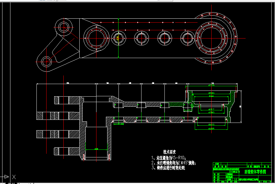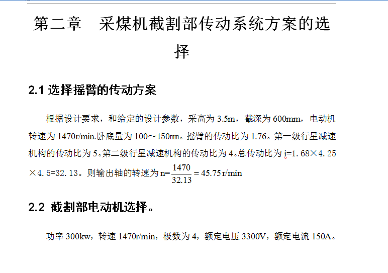 截割部摇臂传动设计部分是本毕业设计的首要工作。在本部分首先确定了摇臂内各零部件的传动方案、分配传动比、初步确定个齿轮的齿数、齿轮的设计计算及其校核、行星机构的设计计算、轴的设计计算及其校核、并初步选取了轴承和键,之后简单分析了内喷雾系统的工作原理,以及简要分析了各个零部件的作用。