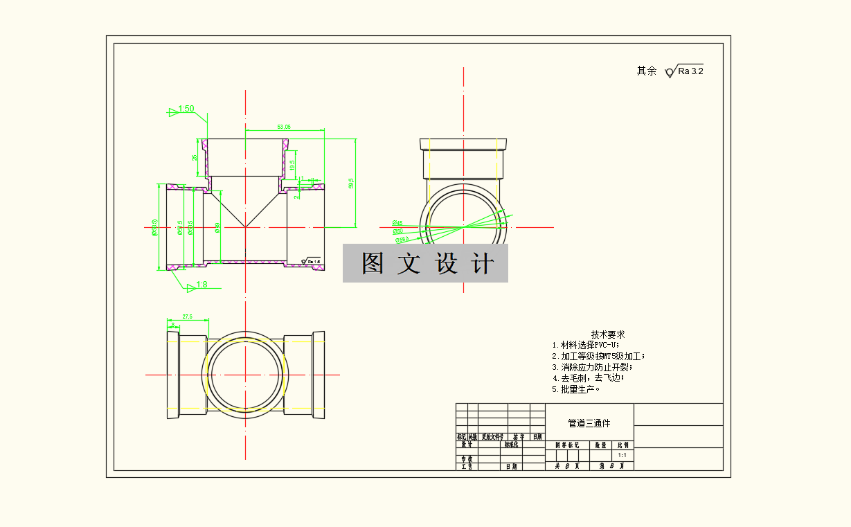 本次设计任务是三通管的模具设计,首先对塑件进行结构分析:使用量具测得外形轮廓尺寸为 105x89x58,内部通孔45 正交且等直径相贯,孔口有一端部尺寸为 50、锥度为 1:50 的内锥孔用于对外连接和配合,制件上若干倒角,任务是设计出一套合理可靠的注塑模具,本塑件采用管路常用的 PVC-U,考虑到模具效率的需要、注射机最低注射量和经济性的要求