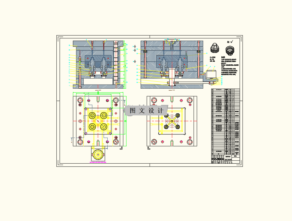 本次设计的任务是蚊香液瓶盖注塑模具设计,结合设计要求和实际生产确定模具的结构形式。首先对制件进行结构分析,该制件为壳类零件,其壁厚大约为 1.5mm。因制件的内部存有内螺纹结构,所以采用螺纹抽芯中的液压马达抽芯机构。 接着利用 MoldFlow 软件,选择两种不同的浇口位置进行模流分析。一种是采用位于制件顶部的点浇口,另外一种是位于构件侧壁的侧浇口。进行综合比较后,两者的分析结果相近,结合实际使用要求,选取位于制件顶部的点浇口方案。 最后,在模流分析基础上进行模具设计。从模具设计原则及实际生产需求方面考虑, 采用一模四腔式结构。型腔布局时多采用整齐排列的方式进行布局。型芯型腔采用嵌入式的结构。在选择制件的分型面时要保证便于脱模,因此,制件的分型面选在制件的最大截面处。工作时,液压马达通过链条与齿轮的配合带动螺纹型芯向下转动实现脱模。冷却系统选择上下环绕式冷却水道冷却。