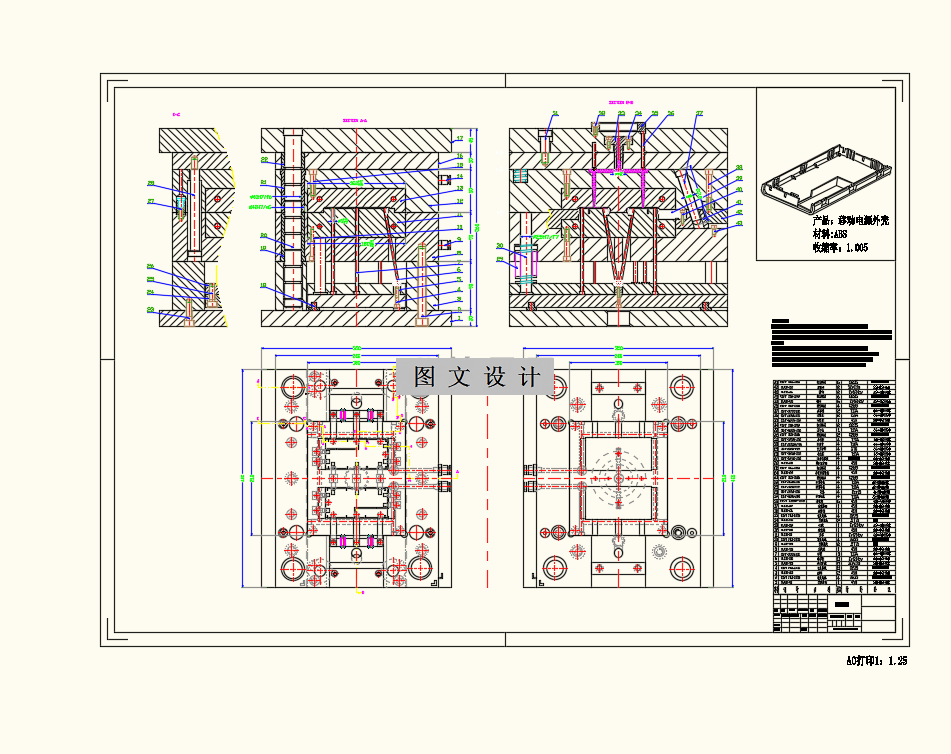 本次设计选择的题目是一个针对移动电源外壳塑件的注塑模具设计,顶面有一个贴标签的浅槽,下面有 2 个侧耳,侧耳有两个孔,这两个孔需要做滑块抽芯,内部有很多加强筋。 接着利用 MoldFlow 软件,选择两种不同的浇口位置进行模流分析。一种是采用位于制件顶部的点浇口,另外一种是位于构件侧壁的侧浇口。进行综合比较后,两者的分析结果相近,结合实际使用要求,选取位于制件顶部的点浇口方案。 在模流分析基础上进行模具设计。为了满足市场需求以及生产效益等条件采用一模两腔式结构。分型面设计在零件的下平面轮廓处,这样成型比较容易脱模也比较顺利。本次设计就采用了简单环绕式冷却水道,大大的简化了模具的结构以及节省加工成本。