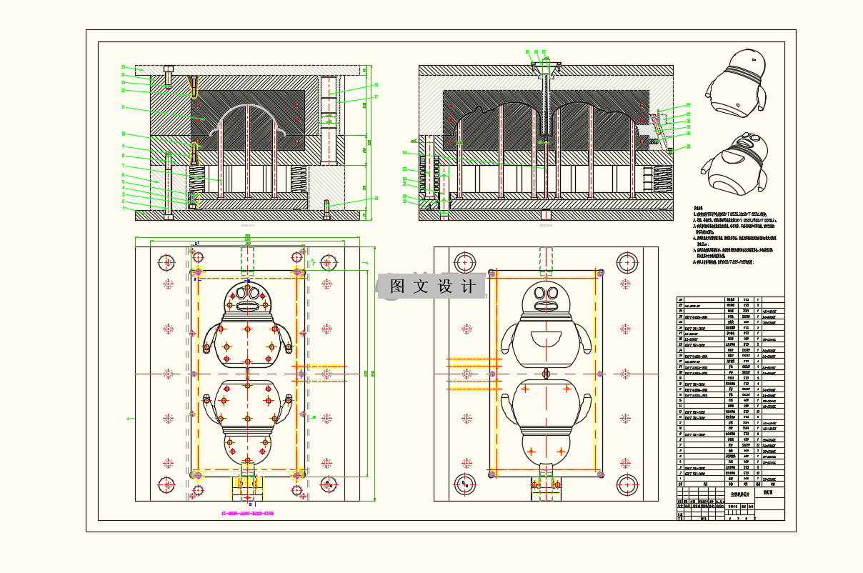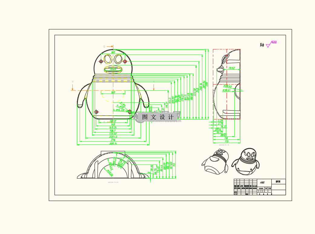 该论文的设计主题是对某企鹅上下壳体的注塑模具进行设计。通过对该制品的零件图纸进行分析,然后采用三维软件对其建模分析可知该塑件属于壳体类零件,塑件的整体尺寸大小要求外表面光滑,结合塑件在设计生活中的应用以及该制品的结构、形态、加工批量的相关要求,对该制品的加工材料进行选择,确定加工材料为 ABS。 综合上述分析,采用软件对该注塑模具的相关功能结构进行设计,其主要内容有:动定模、浇口、流道等进行设计,其中包括对各项参数的计算与模块的设计;随后对该模具的模架、排气系统、温度调节系统以及抽芯系统等各个部分的相关参数进行计算,然后完成设计。最后对完成的注塑模具选定的注射机完成校核的,确定其是否符合设计的要求,使用 MOLDFLOW 软件分析塑件的充填冷却是否均匀合理并对应的做出调整。通过上述的设计和计算,最终得到该注射模具装配图和三维立体图,并且对该设计过程的说明书进行撰写。 在本次的注塑模具的设计中, 最后通过注塑机参数对模具进行验算校核,同时也可以发现设计过程中潜在的各类问题。通过验证后,可得该模具的设计符合注塑模具相关要求。