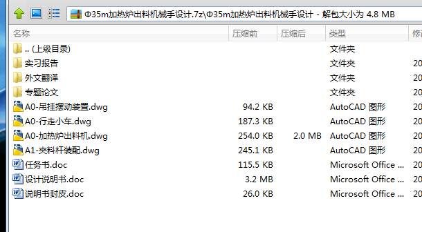 本次设计包括:介绍机械手分类及主要技术指标;确定本设计中加热炉出料机械手采用的方案;出料机械手主要参数的计算;液压元件及缓冲元件的选择;小车轮轴的设计与强度校核以及主要机械零部件的设计及强度校核。