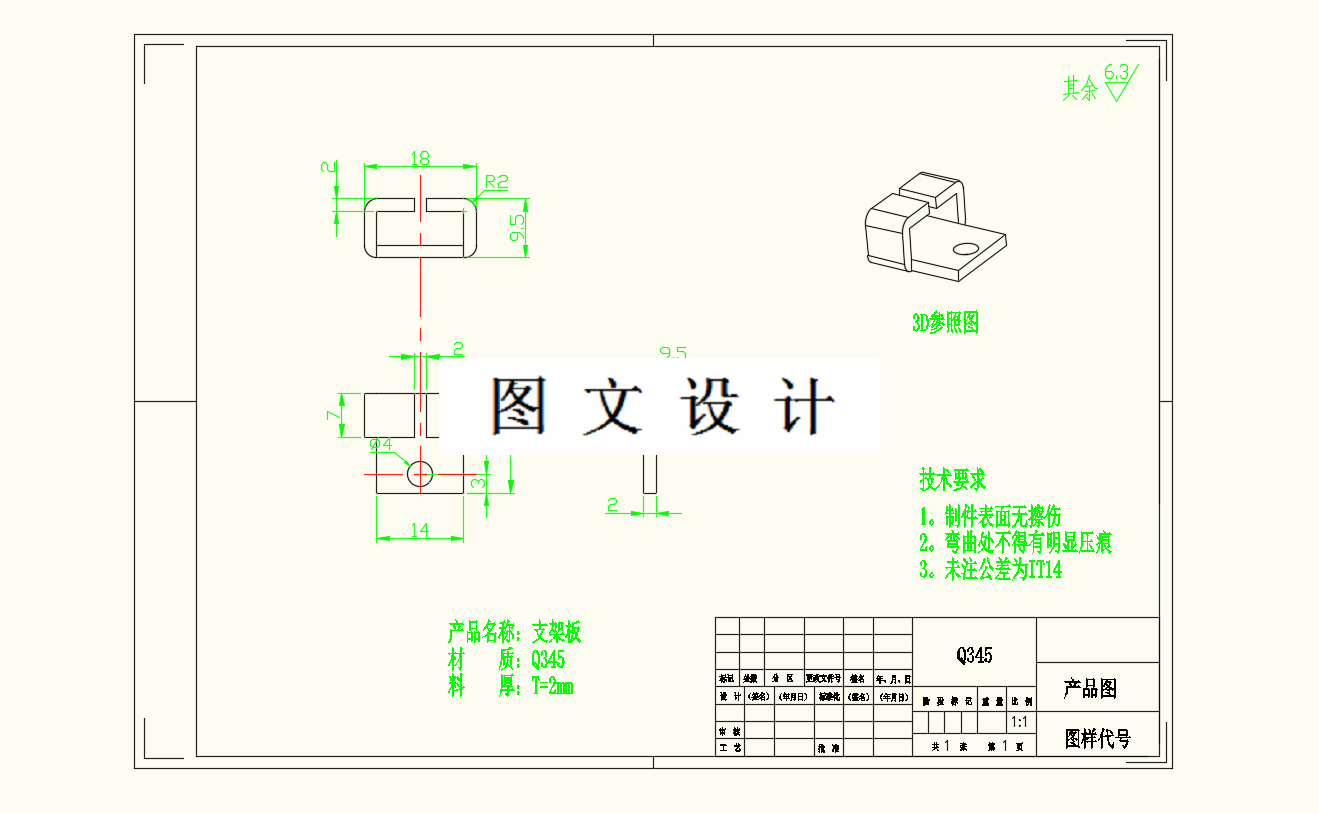 此次的毕设任务为制造支架板的冲压模具的设计,经过对支架板的结构,生产精度要求以及生产材料等各方面的分析。最终确定Q345是本次毕业设计所选用的材料。Q345分为冷轧钢和热轧钢,虽然冷轧钢成型壁厚较小,但支架板壁厚也仅有2mm,而且成型速度快,产量大,非常符合此次任务目标大批量生产的要求,因此此次设计选用冷轧钢。 支架板总体外形简单且规则,此制件外形规则,壁厚均匀,壁厚仅有2mm。 支架板有1个圆孔,孔直径为4mm,上边有向内弯曲。弯曲要分为两次,支架板弯曲处最小弯曲半径0.5mm。 经过初步分析,可以基本确定此次任务目标是一个比较常见的落料冲孔弯曲件。其次对于任务要求用于支架板生产的材料,我们需要进行计算检验,分析材料的工艺性能是否满足支架板的生产需要。然后对支架板的结构进行分析,我们发现支架板的生产需要冲裁,冲压,弯曲等工艺。要实现以上的生产工艺,我们可以选择单工序模,复合模或者级进模来实现,但为了实现大规模生产的目标,单工序模式明显不可以选用。 毕业设计是对于我们四年所学的一次综合检验,不仅仅考验我们关于专业知识的掌握,而且对于我们脱离书本,利用各种资源完成任务有很高的要求。此次支架板的设计说明书论证了其在现实生产中的可行性