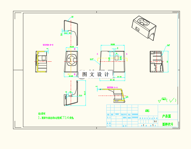 模具是现代工业中必不可少的一种设备,为工业发展做出巨大贡献,并且对于经济发展起到促进作用,并且也作为衡量一个国家制造技术高低的关键因素,随着工业快速发展,模具的使用范围越来越广泛,并且地位在不断提高。模具产品遍布的产业也比较广,被用于工业设备,汽车生产,电器制造等领域,全球模具产值也正在稳定增长,我国模具技术也在趋于成熟,跻身全球模具制造大国中,在满足国内模具市场的需求外,还能实现模具出口加工,国内模具市场比较活跃。 本次设计的为座椅侧按钮注射模,为普通的塑料产品,运用模具相关知识,分析塑料产品工艺要求,尺寸精度要求,选取ABS材料,并且对本次模具的塑件分型面选取,型腔分布确定,选取为一模四腔形式,侧浇口进浇,同时计算产品的注射量数值,选用满足要求的注塑机,同时对注塑机的压力机锁模力等做出校核,且对成型零件设计,计算其工作尺寸等,并且通过制图软件绘制模具装配图零件图等,最终完成任务要求