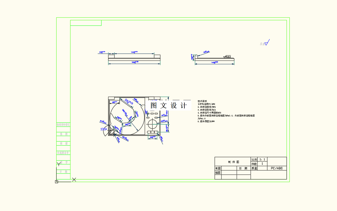 本课题来源于 Hi-Fi 音响市场中占有率比较高的 CD 机里一个重要的部件——型号为 XFG5 的 CD 面板,并针对其进行注塑模拟以及注塑模设计。制件外形尺寸不大、精度不高,壁薄,材料为 PC/ABS,各表面之间采用阶梯状进行连接过渡,要求设计的制件成型应该饱满,表面光滑,无缩水气泡等不良现象,无变形、翘曲。首先,运用 UG10.0 软件对塑料制件建立三维数学建模,从塑料制件的材料特性、成型性能以及结构造型的特点等多方面的分析塑料制件的加工工艺性;应用 Moldflow 软件对塑料制件进行注塑模拟分析,从分析结果中找到合理的注射位置和注射条件。然后,通过上述的分析结果确定其分型面为塑料制件底面,一模一腔,浇口形式选用侧浇口。接着,对注射机型号、模架、浇注系统、模具零部件、推出机构、冷却系统等进行相关的计算、校核和选择, 确定注射机型号为 XS-ZY-125,模架型号为 A1 型 450mmx400mm,型腔为整体式,脱模机构为推板推杆,冷却水道环绕于制件。最后,绘制模具装配图和主要的模具零件图。