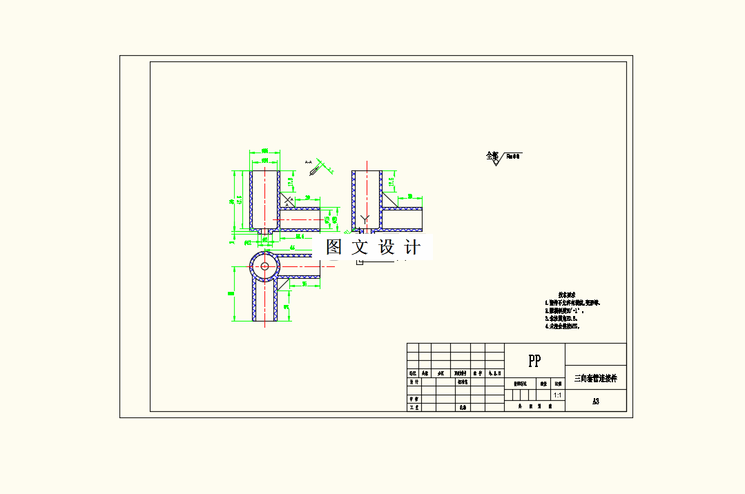 这一次的设计内容为三向套管连接件的注射模具设计与注射模拟分析。该塑件为日常生活中常用的一类连接件,选用聚丙烯(PP)塑料成型。主体高度52mm,壁厚在2.5mm左右,选用聚丙烯(PP塑料)注射成型,该塑件由一25mm的管道为主体,底部有孔,在其靠近底部的两侧有两个20的管道连接,三个部分互相成90°转向。在生产实践中,大批量生产的类似塑料产品都是采用注射成型工艺来生产,而模具是塑件注射加工中最关键的部分。将要使用Moldflow软件来对三向套管连接件进行数值模拟分析,以便可以合理确定浇注系统和冷却系统等,消除缺陷。然后进行成型零件设计,成型工艺参数的计算,还有注射机型号的选用,还要去设计修改模具零件等部位。最后还要去了解分析模具的开模过程,并对注射机进行相关数据的校核。该模具结构采用一模两腔,潜伏浇口,液压抽芯,推管推出塑件完成脱模。结构紧凑,工作可靠,效率高。