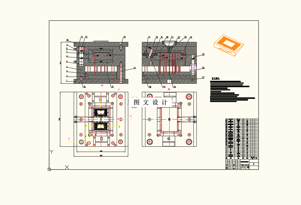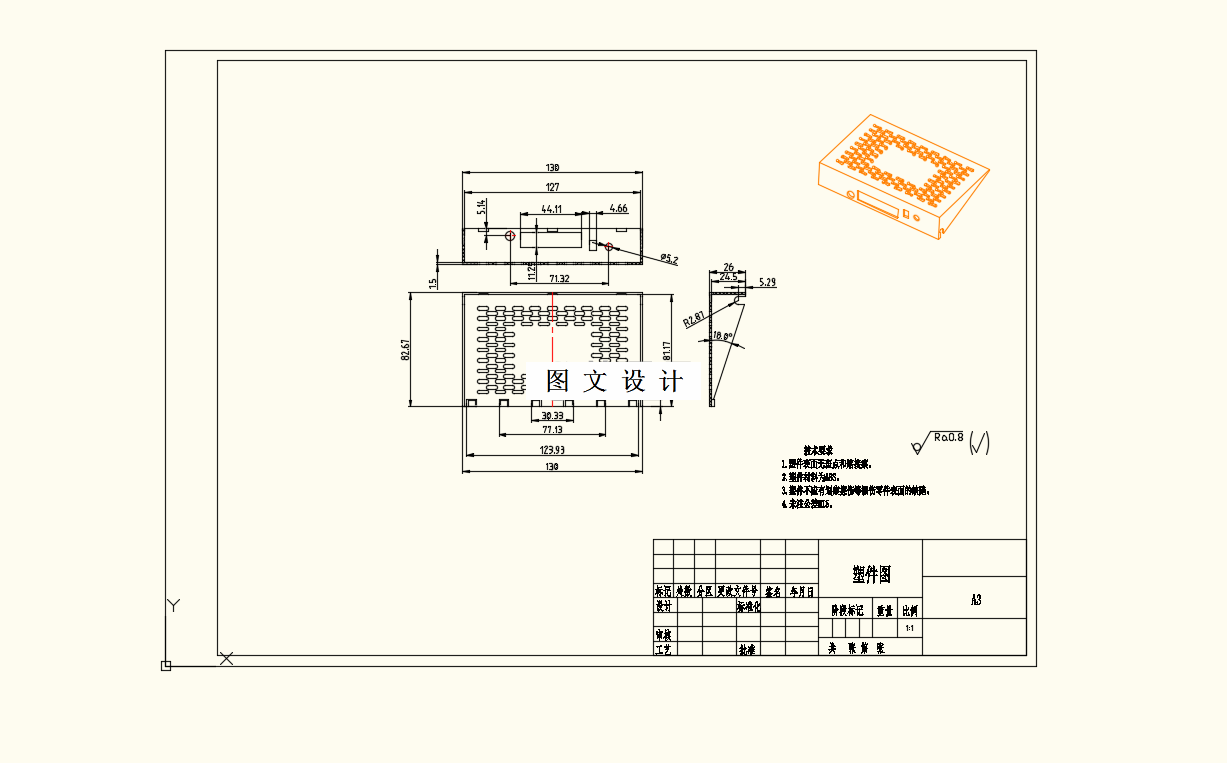 本次课题的目的是设计一副注射模具来生产路由器下面板外壳。针对该塑件的模具设计,经过查找资料且对此塑件进行结构与工艺分析,决定采用注射模。塑件采用 ABS 材料,该材料在日常生活中有着广泛的应用。此塑件有多处外抽结构,底面及侧壁带有 x 许多通孔,因此设计由侧抽芯机构。在本设计中还特意针对塑件,进行了模流分析,针对模具的浇注系统以及流动分析做了一系列的报告。本设计考虑到塑件的工艺性与模具结构,对模具的成型零部件、注塑模推出机构、加热与冷却系统、浇注系统、排气系统、支承零部件的选择、注射机的选择以及相关参数的校核等都有着详细的计算过程。针对该塑件,设计滑块、斜导柱、楔紧块。型腔数量方面设置为一模两腔结构。此次设计过程表明该模具能够达到外壳所要求的加工工艺。