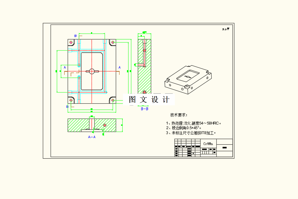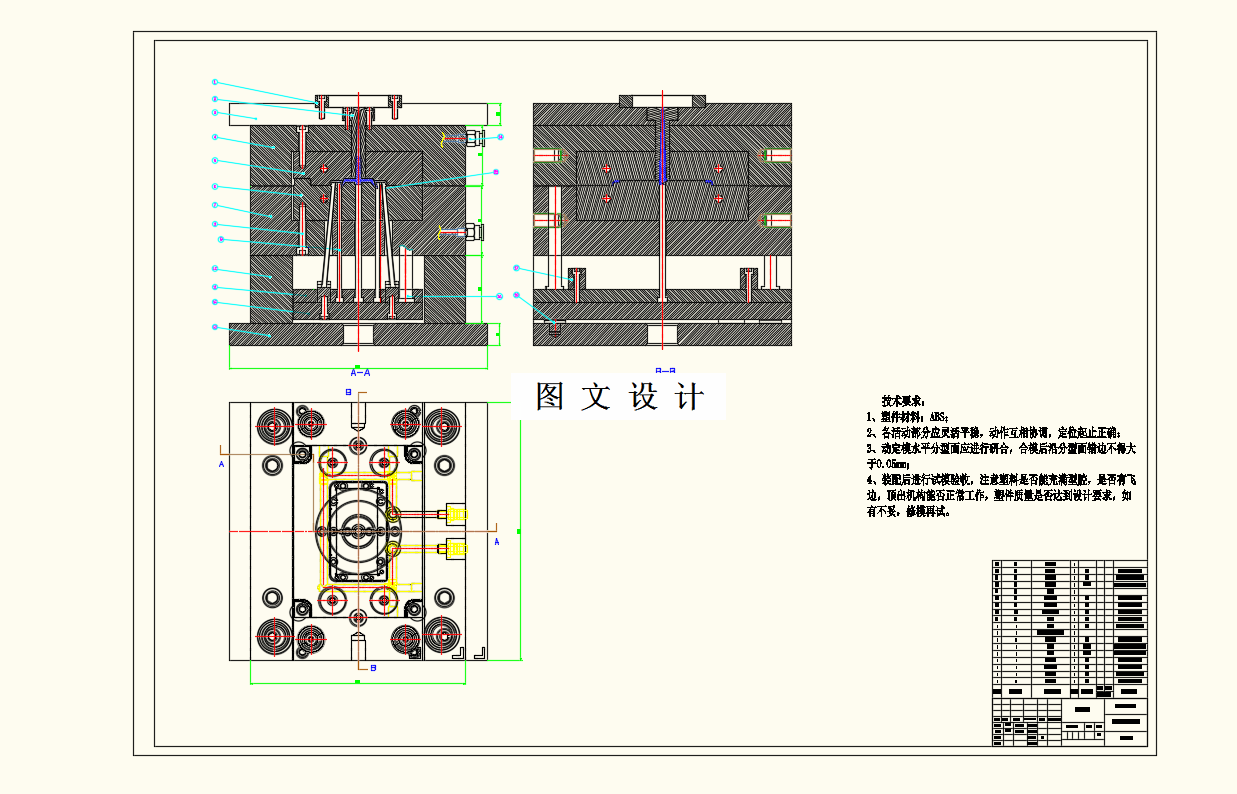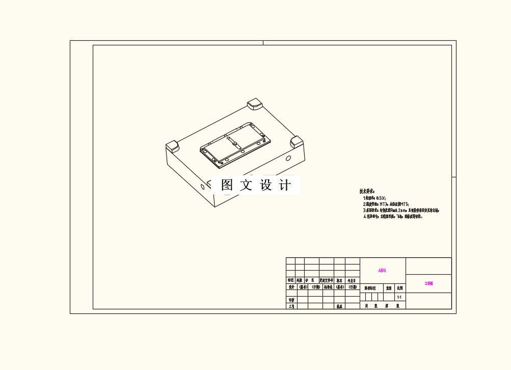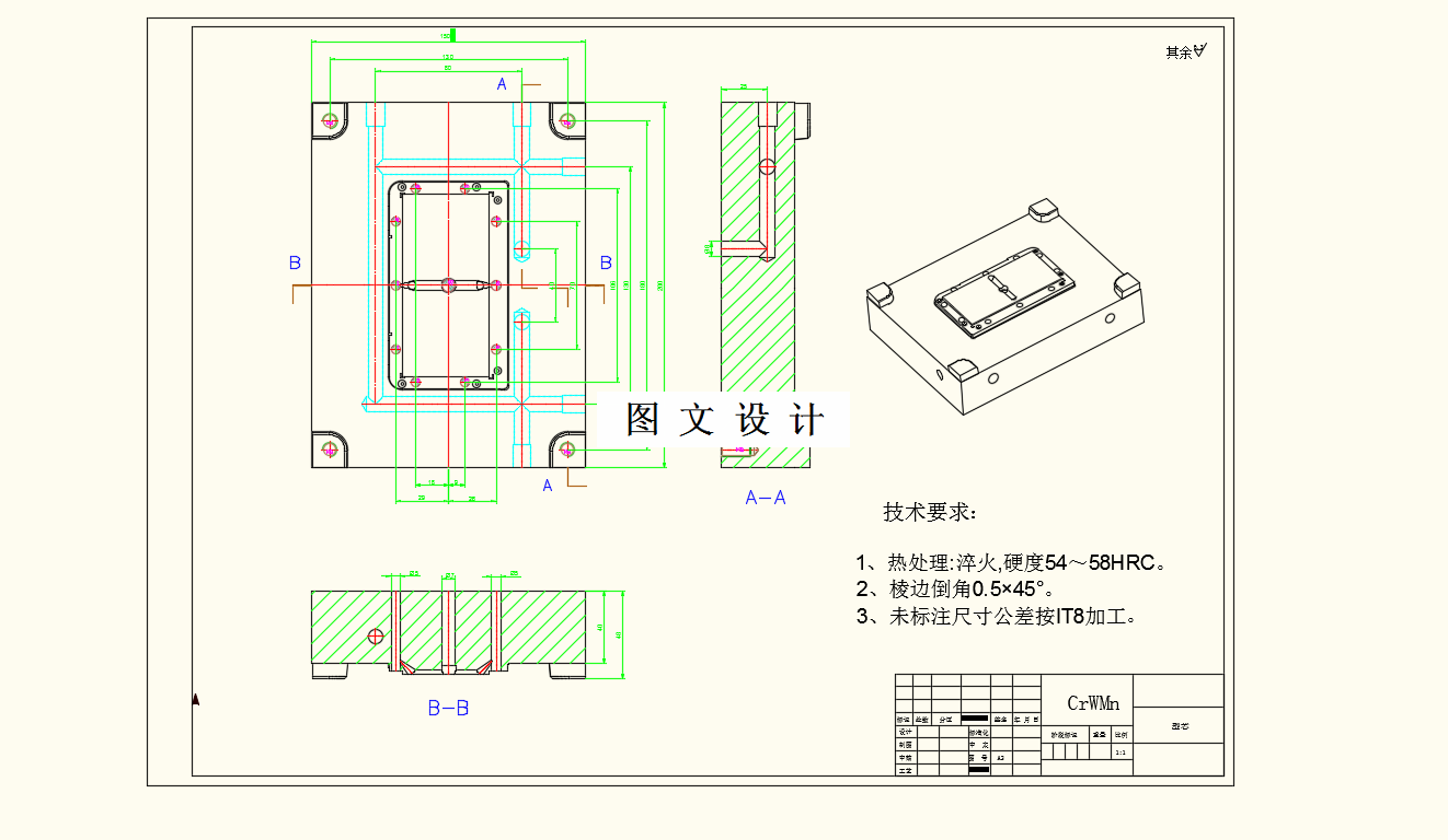 本次设计题目是卡盖的注塑模具设计,在设计前首先要了解注塑模具的成型过程,同时考虑经济因素,降本增效,最后保证实际生产方便安全。卡盖的模具设计需要考虑到注塑、冷却、开模、取件等流程通过这些流程再一一设计相关的成型系统。 设计详细介绍注塑模具的注射机选择、产品零件的分析、分型面的选择、型芯型腔的排列、标准件的选择,注射容量的计算、锁模力的计算、顶出系统的设计、浇注系统的设计、导向机构的设计、模具成型零件尺寸计算、调用模架等,用CAD进行二维图绘制及标注卡盖的装配图及重要零件图。