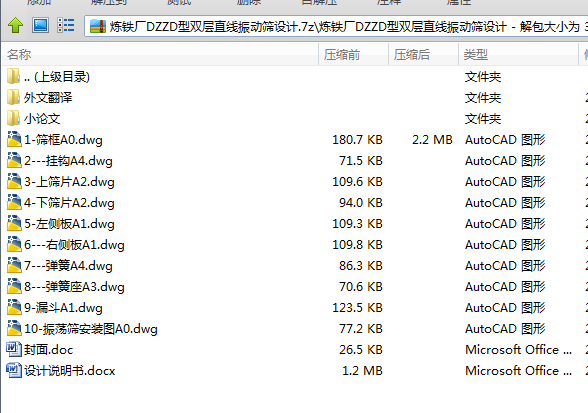 本设计题目是关于包钢炼铁厂矿用筛分机械——振动筛的设计,即:DZZD-05振动筛的设计。其主要任务是根据筛分机械的工作原理,用途及经济要求;并且考虑到筛分机械的工作特点和工作环境的情况下,对已有筛分机械的部件进行改装和创新的设计计算,以达到工程技术要求和使用寿命要求。