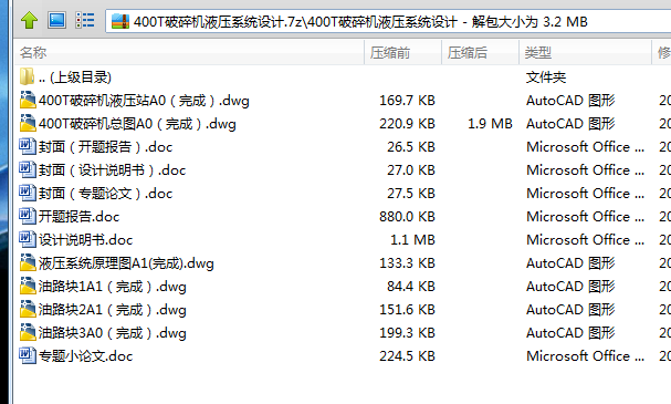 破碎机在机械设备中起到举足轻重的作用,其中,液压破碎机是以液压泵为动力、液压油为工作介质,用液体压力驱动活塞做功来进行工作,将液压能转换为机械冲击能的一种破碎工具。400T液压破碎机利用输入的高压油推动柱塞缸对放入破碎腔内的炭块进行挤压破碎,使炭块体积变小,更好的进行下一步加工利用。本设计主要针对400T破碎机的液压系统进行设计。本文介绍了破碎机液压系统的设计过程,并将液压系统的组成和工作原理展现出来。其设计内容主要包括以下几个方面:破碎机的工况分析、系统总体方案的确定、液压系统原理图的设计、执行元件参数的计算、液压元件的选择、系统性能的验算、集成块和液压站的设计等。通过理论验算完全满足每小时5吨生产能力和排料粒度小于150mm×150mm的设计要求。解决了炭块体积大,需求量大,强度高,人工破碎难的实际问题。