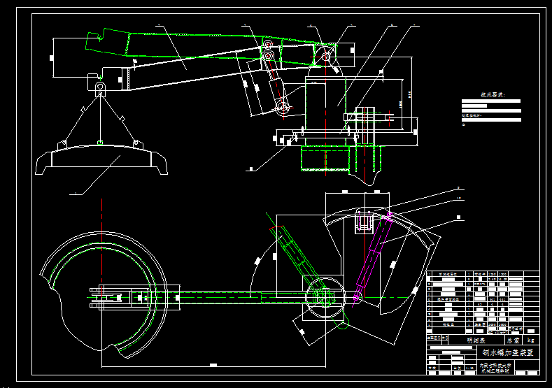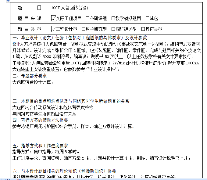 这次设计的题目是蝶形钢包回转台,蝶形钢包回转台是是属于双臂整体旋转单独升降试,它是目前回转台最为先进的一种形式,钢包回转台是现在连续铸造和炼钢过程中最普遍的运载和承托钢包进行浇注的设备,通常设置与钢水接受与浇注跨柱列之间。所设计的钢包回转半径,使得浇钢包水口处于中间包上面的规定位置。用钢水接受跨一侧的吊车将钢包放在旋转台上,通过回转台回转,使钢包停在中间包上供给其钢水。浇注的空包则通过回转台回转。在运回钢水接收跨,在设计钢包回转台的过程中,主要包括正常态体和事故状态下钢包回转台传动方案的设计,回转台结构尺寸的确定,主要零件的选择、计算与校核;电动机、减速器、气动马达、液压缸的选择与计算,以及钢包升降装置、锁紧装置、称重装置、加盖装置的设计,此外,还介绍部分主要零件具体的安装、维修、润滑、操作方法。