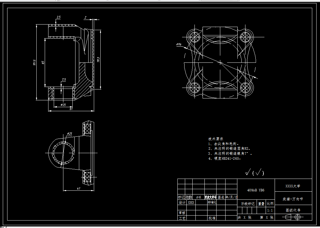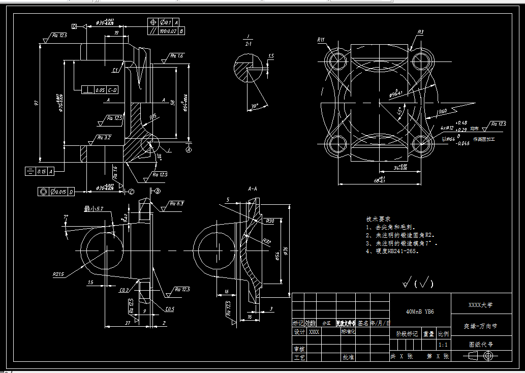 凸缘叉加工工艺规程及夹具设计是包括零件加工的工艺设计、工序设计以及专用夹具的设计三部分。在工艺设计中要首先对零件进行分析,了解零件的工艺再设计出毛坯的结构,并选择好零件的加工基准,设计出零件的工艺路线;接着对零件各个工步的工序进行尺寸计算,关键是决定出各个工序的工艺装备及切削用量;然后进行专用夹具的设计,选择设计出夹具的各个组成部件,如定位元件、夹紧元件、引导元件、夹具体与机床的连接部件以及其它部件;计算出夹具定位时产生的定位误差,分析夹具结构的合理性与不足之处,并在以后设计中注意改进。