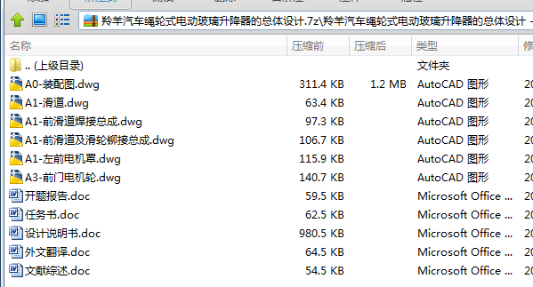 本次设计主要包括升降器的基本分类和工作原理的介绍,主要针对绳轮式汽车玻璃升降器进行设计,包括电机、钢丝绳等主要部件的选择及系统运动的计算分析。共完成图纸近6张,基本完成老师所交给的任务。