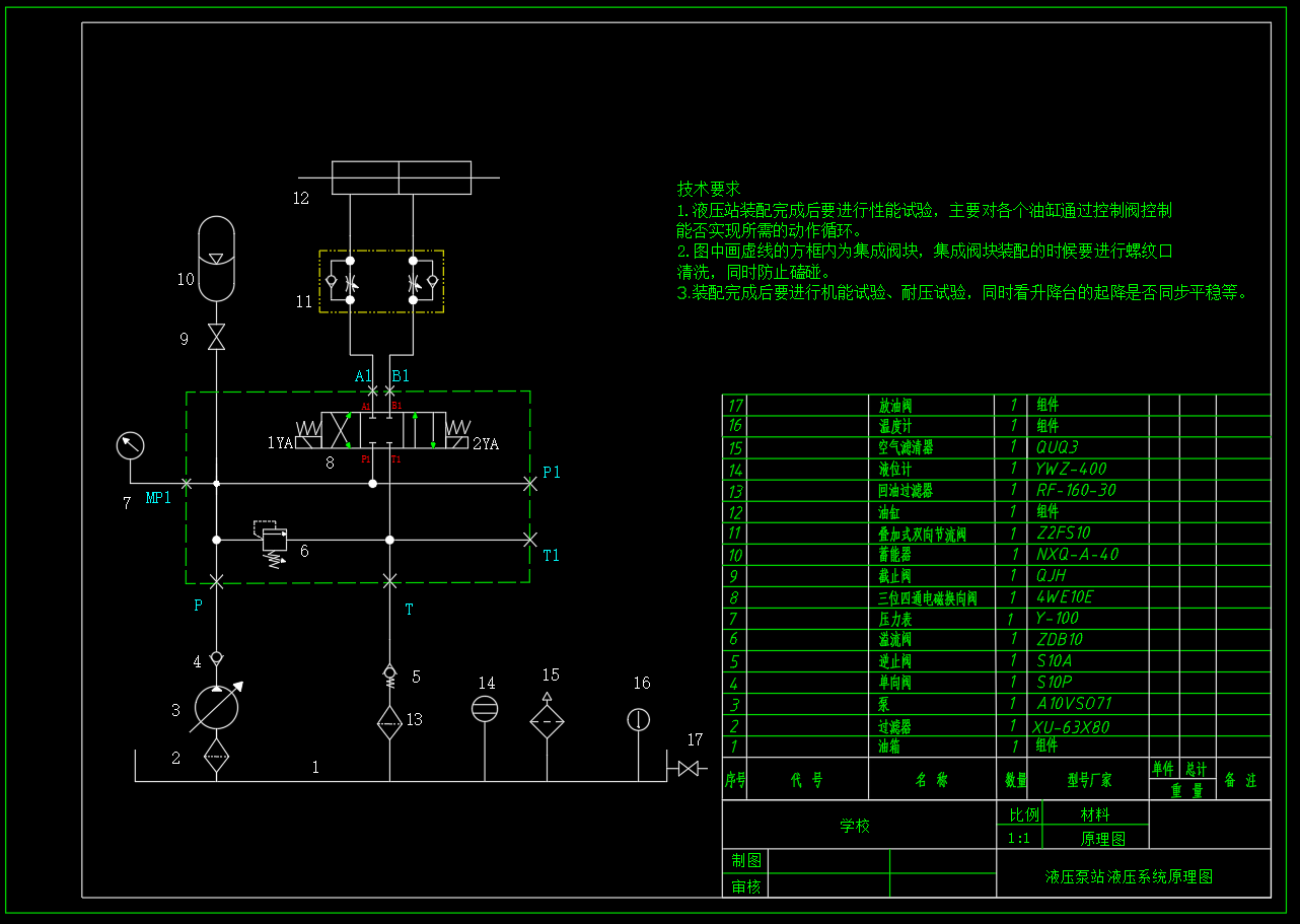 甲方有一执行元件(双活塞杆液压缸),要求乙方设计一液压动力站来驱动该执行元件往复运动。 1.液压泵进出油口采用法兰连接或螺纹连接; 2.液压泵由Y型三相异步电动机驱动; 3.液压泵与电机之间采用“电机-泵连接套”连接; 4.执行元件往复运动的速度可调; 5.执行元件最大工作压力P1=8MPa; 执行元件所需最大流量q1=65L/min。