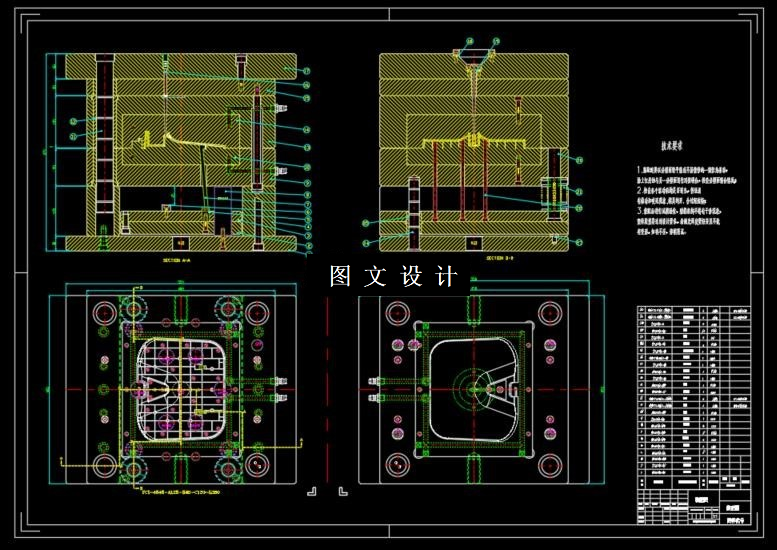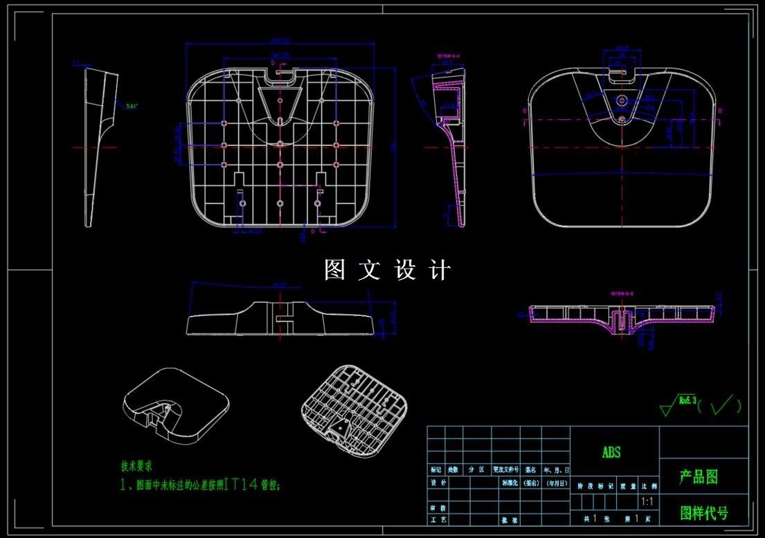 显示器底座采用的材料是abs,是一种热塑性材料,符合注射模的要求.它的精度要求不高,一般4级就能满足要求.根据任务书要求,该制件属于打批量生产,所以采用了一模一腔设计,凹凸模开设在定模板和中间板之间.采用普通浇注系统点浇口的形式.根据估算制件和浇注系统凝料的重量.选用HTF200J/TJ型注射机,.分型面设在定模板和中间板之间,分型时利用拉料杆将凝料一同拉出,再用推杆和拉料杆一同将制件和凝料顶出.根据制件的精度要求和尺寸大少算出型腔和型芯的尺寸公差,再根据强度条件取壁厚5mm.由此画出各模板和零件图,最后画出装配图并校核各参数,校核无误才能使用.整个设计过程必需严谨,不能疏忽每一个环节,有关标准参考相关机械相关设计手册.此套模具结构简单,实现部分机械的自动化.