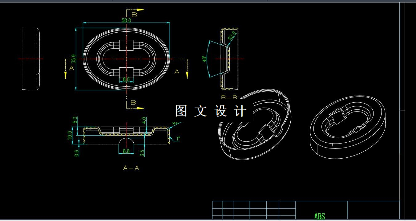 本次设计的产品为圆形塑料外壳B塑件,具有重量轻,强度高,耐腐蚀,易清洁等 特点,为大批量生产产品。本次设计在针对产品进行工艺性分析后,确定模具分 型面、 型腔数目、 浇口形式、 位置大小; 其中最重要的是确定型芯和型腔的结构, 以及它们的定位和紧固方式。此外还进行了脱模机构的设计,合模导向机构的设 计,冷却系统的设计等。最后绘制完整的模具装配总图和主要的模具零件图及编 制成型零部件的制造加工工艺过程卡片。实践证明:该模具结构合理、可靠,并 能保证产品质量,对此类注射产品的模具设计有参考价值。