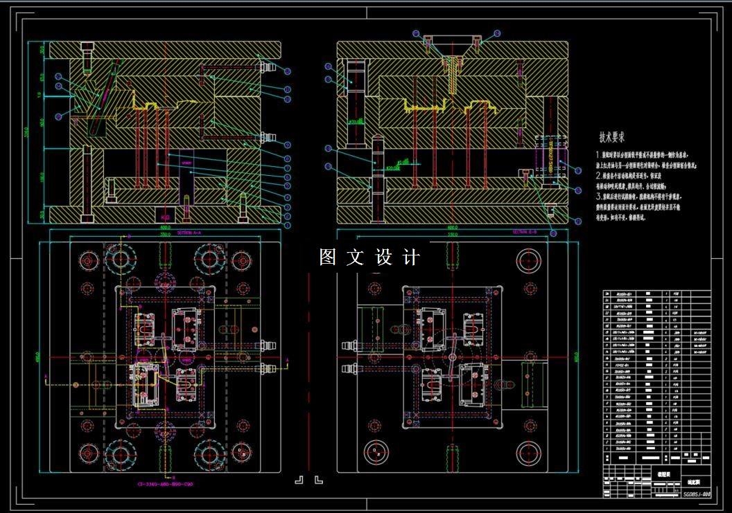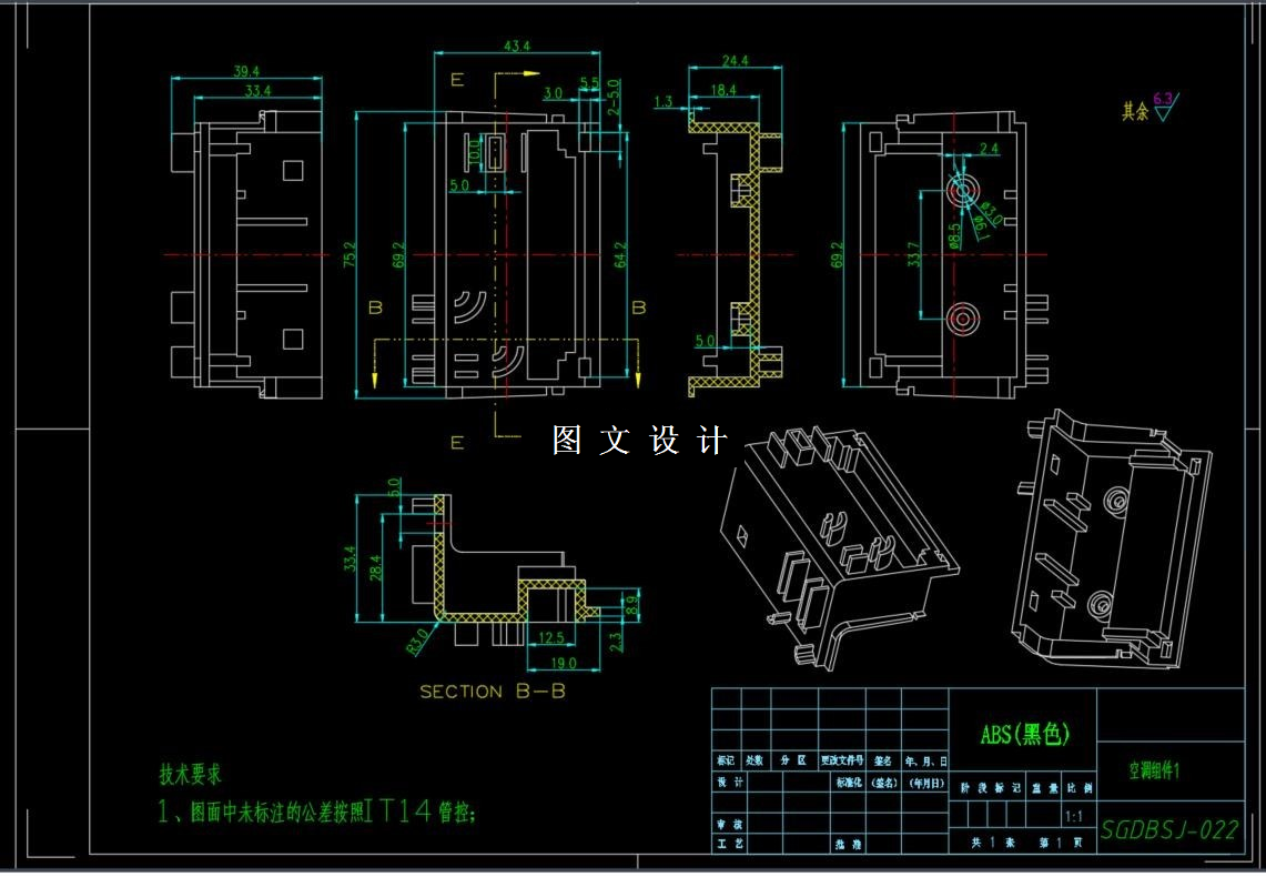 本次设计中,采用了计算机辅助设计软件,其中包括二维设计软件AutoCAD绘制模具的总装图与非标的零件工程图,采用了三维软件进行了塑件的建模与整体装配建模。在完成全套的模具结构设计之后,对其生产所需的注塑机进行了选择与校核,其中校核项目包裹注塑量、注塑压力、锁模力、安装尺寸、顶出行程等内容。